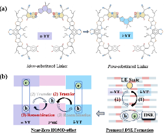 研究团队首次采用基于5,5-二辛基-5H-二噻吩并[3,2-b:2',3'-d]吡喃的不对称基团作为连接体,设计并合成了两种二聚受体o-YT和i-YT(图1),不仅有效提高了受体的能级,还对受体分子的构象实现了调控。研究发现:i-YT同时展现出折叠体构象和拓展构象;而o-YT仅存在拓展构象。在此基础上,研究团队通过一系列具有飞秒时间分辨的瞬态吸收实验进一步揭示:在i-YT薄膜中,定域激子(LE)可以更有效地转化为离域激子(DSE)。因此,在PM6:i-YT共混膜中,即使给体与受体分子之间的能极差几乎为零,处于离域状态的激子在给-受体界面处仍然可以高效地解离,并将空穴从受体快速转移至给体;同时其电子-空穴复合速率也更慢。根据这一原理,研究团队在基于PM6:i-YT材料的有机光伏器件中同时获得了高达0.93 V的开路电压和超过18%的光电转化效率。不仅如此,器件稳定性也表现得更为优异:在经过1400小时的持续光照后,光电转换效率依然能够保持在其初始值的85%水平。