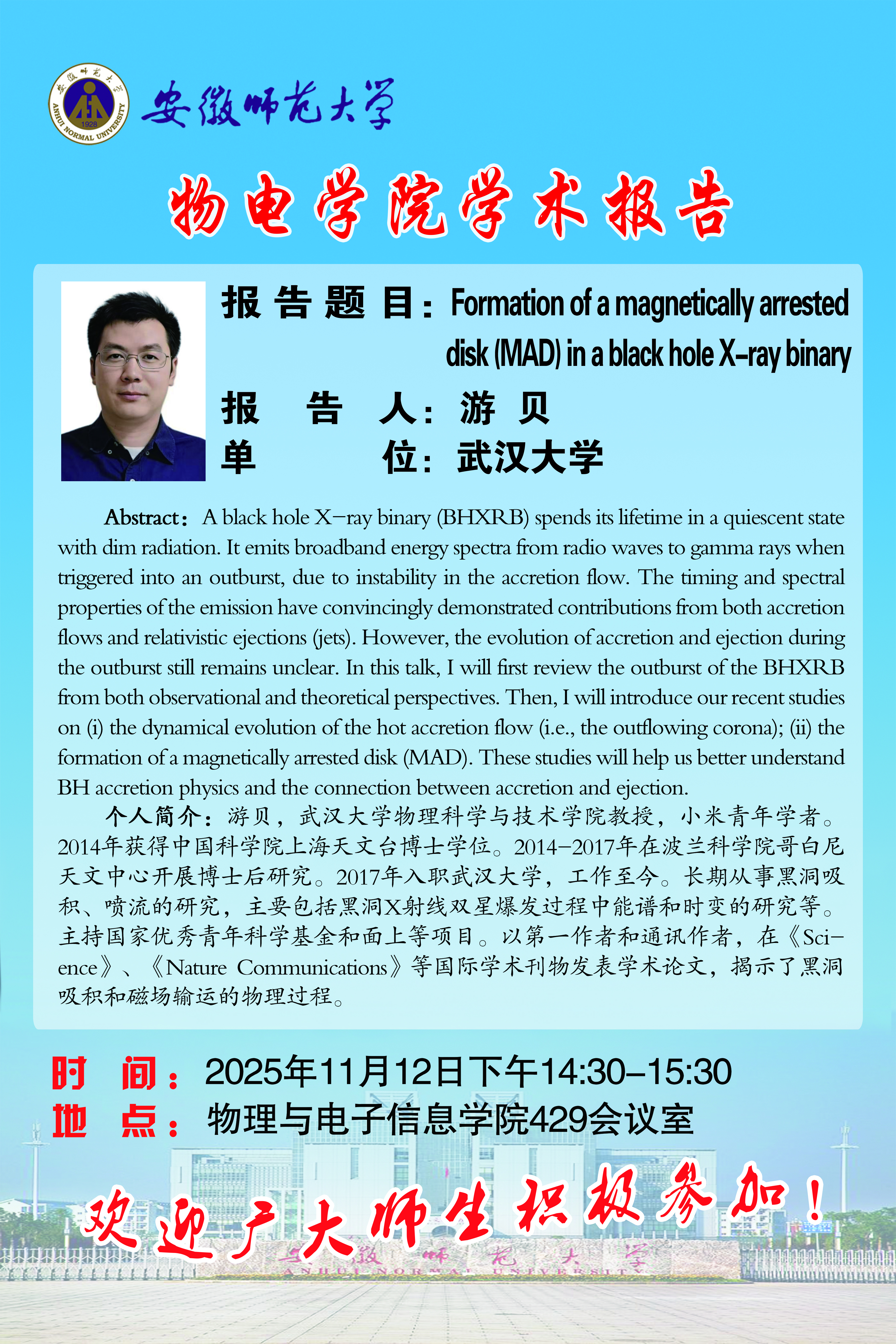 【学术预告】物电讲坛2025年第45期:Formation of a magnetically arrested disk (MAD) in a black hole X-ray binary