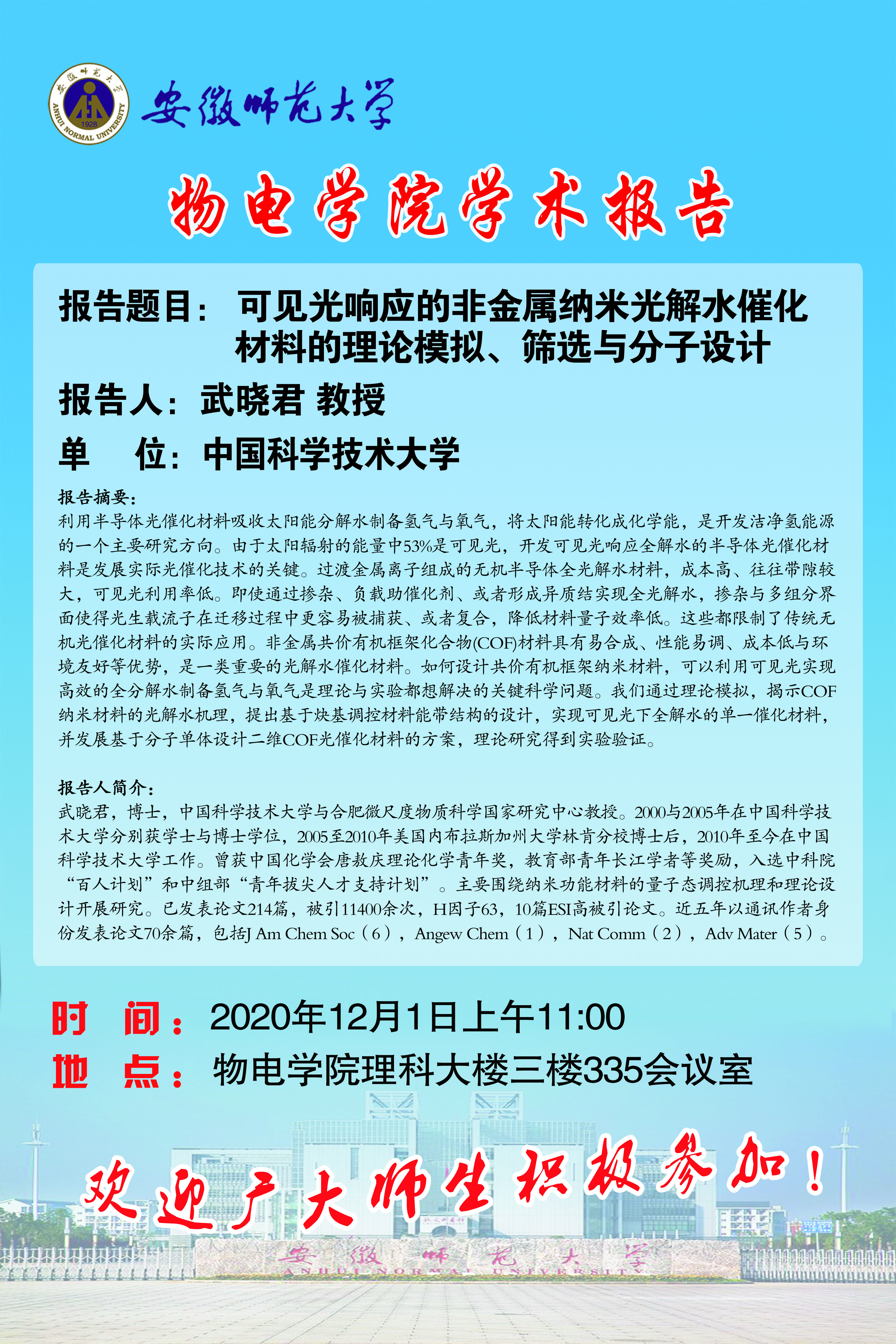 【学术预告】武晓君:可见光响应的非金属纳米光解水催化材料的理论模拟、筛选与分子设计