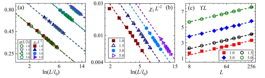 近期,吕建平教授课题组与邓友金教授针对O(2)模型的非凡表面相变开展深入研究,致力于探索该相变的新奇对数标度行为。该团队借助于大规模蒙特卡洛模拟,系统验证了强表面耦合O(2)矢量模型中对数临界指数的普适性和标度关系,由此证实对数普适类的存在性。在此基础上,该团队提出基于两距离标度的物理图像:关联函数体现两种对数标度行为的共存,即依赖于距离的行为和依赖于系统尺寸的行为,分别主导短程和长程区间,两种标度由不同的临界指数刻画。该研究结果已在《物理评论快报》(Physical Review Letters)发表,我校19级硕士研究生胡明辉同学是论文的第一作者【Physical Review Letters 127, 120603 (2021)】。