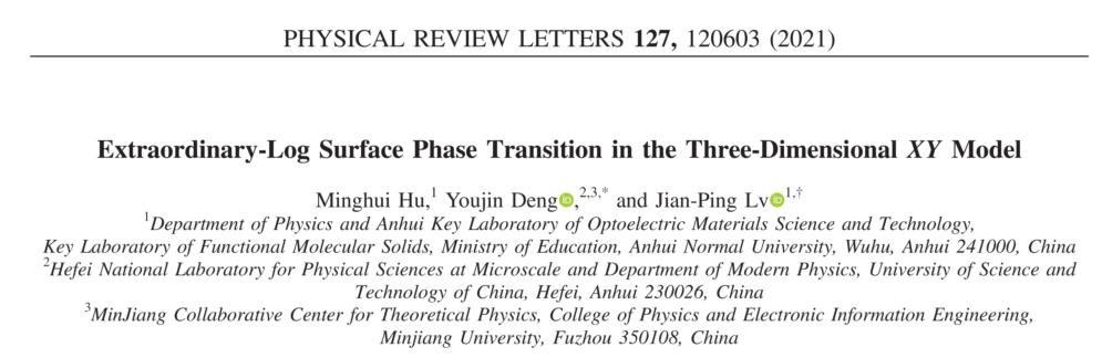 吕建平教授与中国科学技术大学邓友金教授、新泽西州立罗格斯大学陈锟博士等开展合作,给出上临界维度O(n)模型关联函数和自由能的精确对数有限尺寸标度【National Science Review 8, nwaa212 (2021)】。