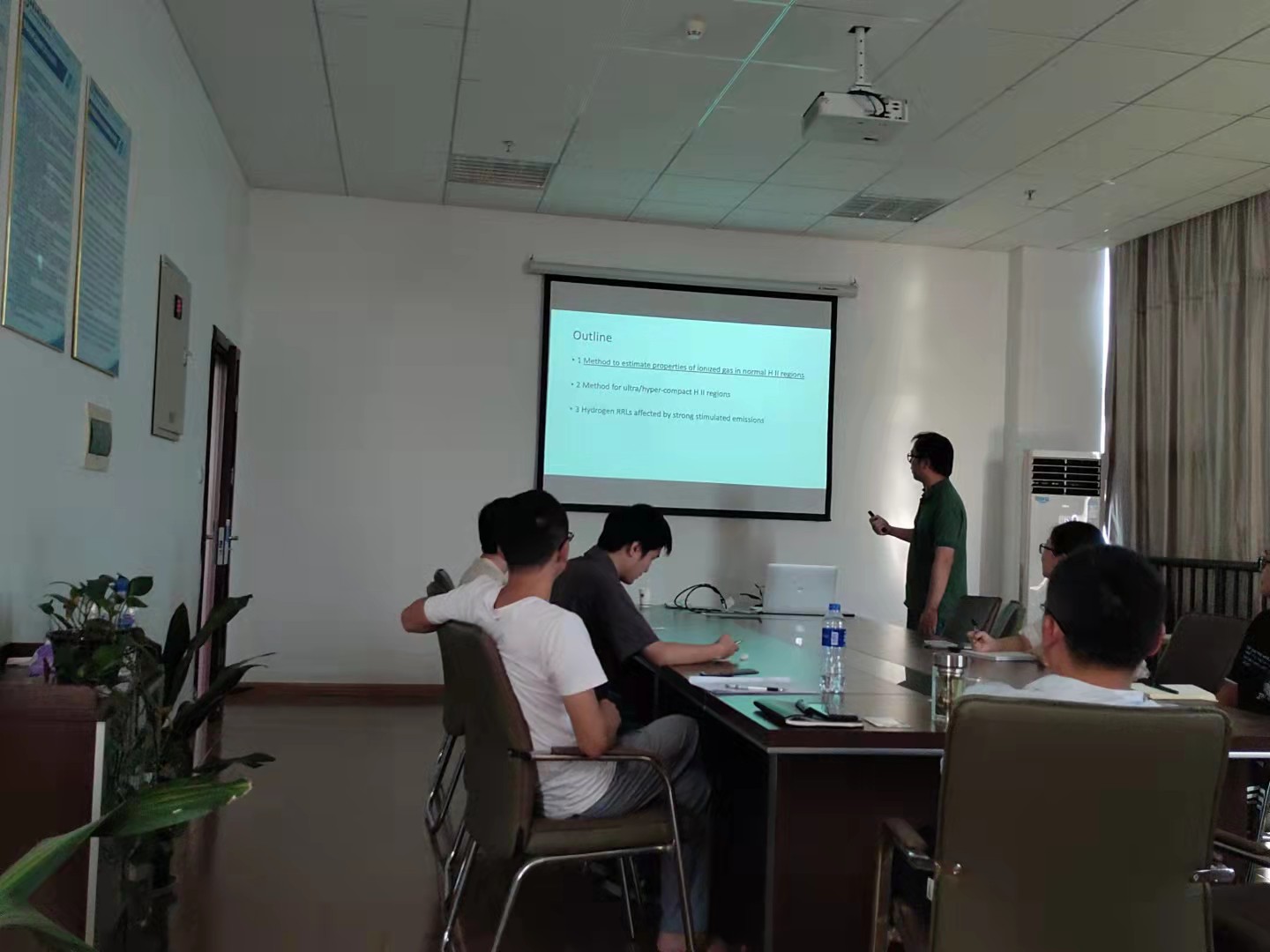 在本次报告会上,朱逢尧博士简要介绍了氢原子复合辐射在天文学中的应用,重点讲解了氢的射电复合谱线在探究恒星周围电离氢区结构和性质中的重要价值,并阐述了经典的、在局域热动平衡(LTE)假设下计算出的氢的能级分布和真实观测结果的偏离。为了得到与观测吻合的能级分布和谱线相对强度,必须抛弃局域热动平衡假设,并重新从基本物理出发开始计算。朱逢尧博士详细介绍了他的计算方法、过程和结果,以及与前人工作的区别;展示了将其计算结果应用于解释电离氢区射电谱线相对强度、理解射电复合脉泽辐射等具体天文学问题的前景。报告会结束后,与会的各位老师和同学就自己关心的问题与朱逢尧博士展开热烈讨论和详细交流。