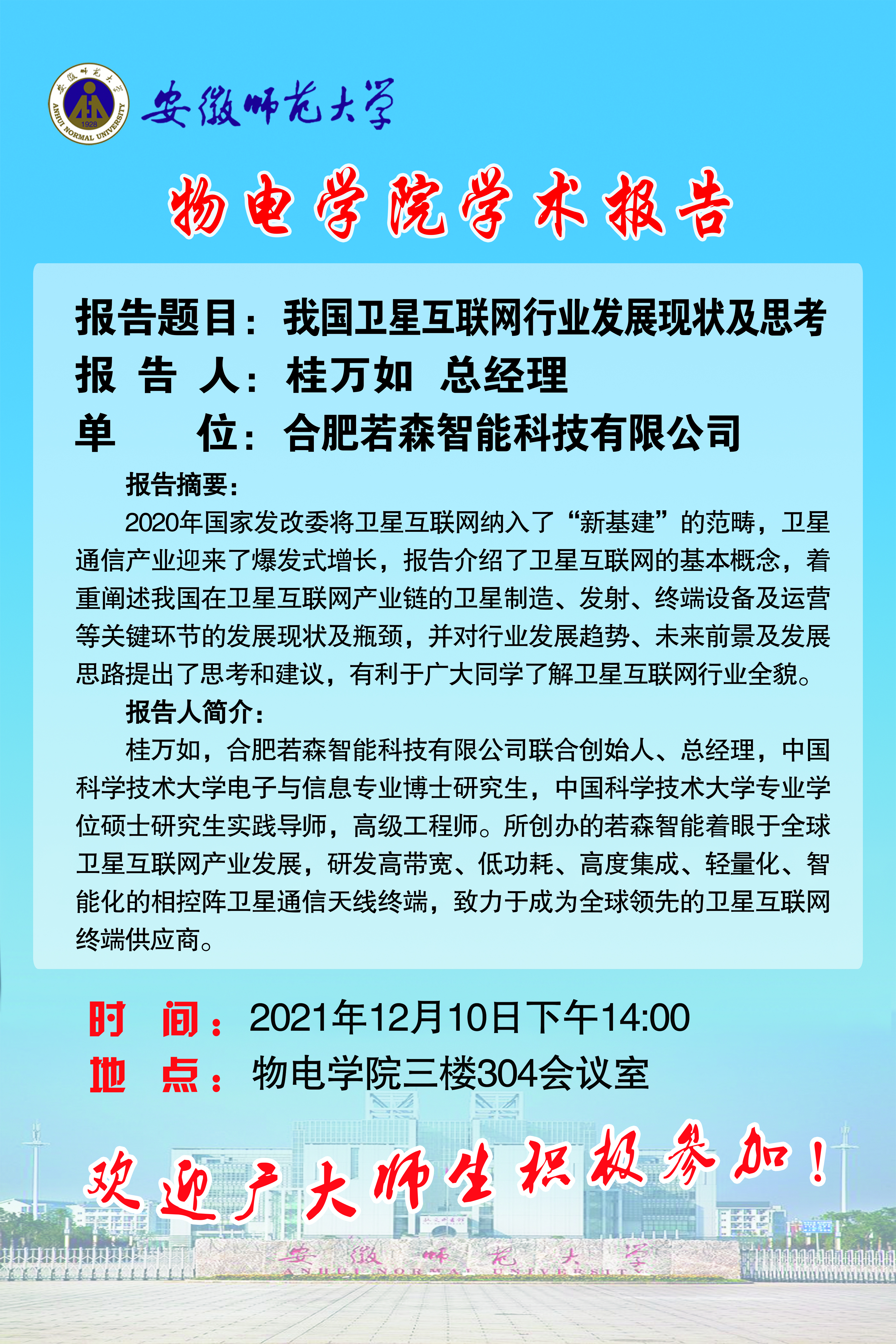 地址:花津校区-安徽省芜湖市九华南路189号 邮编:241000 电话:0553--3869894