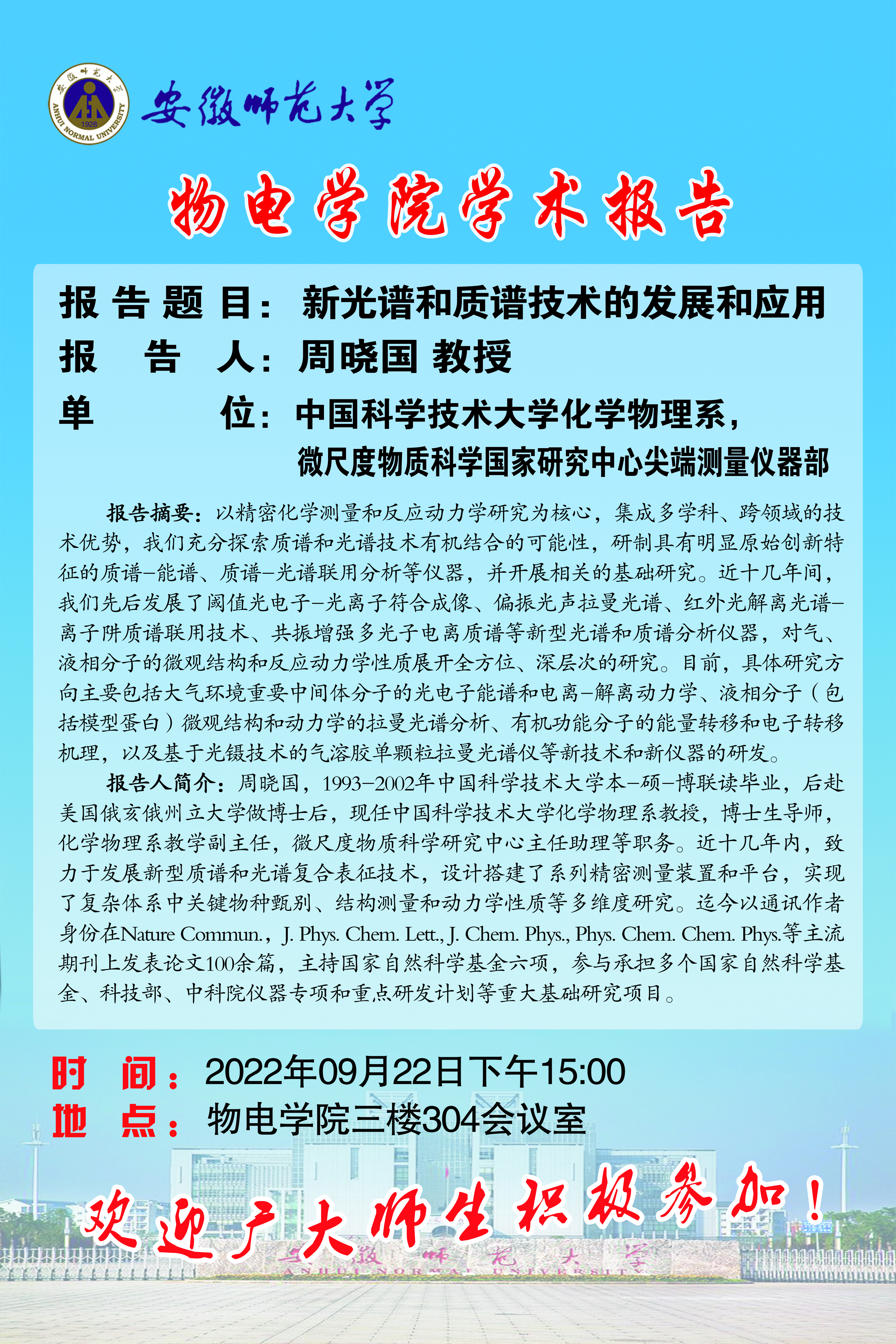 【学术预告·物电讲坛】周晓国:新光谱和质谱技术的发展和应用