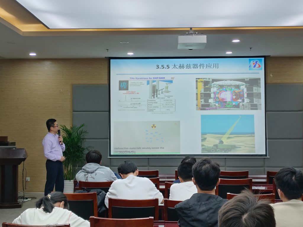 报告会上,席洪柱博士首先介绍了微波及太赫兹波技术在光谱、成像、通信、遥感遥测和雷达等领域的应用前景。随后,席洪柱副研究员结合微波、太赫兹波技术领域核心器件在国内外研究的情况和差距,同与会师生详细讲述了安徽华东光电技术研究所有限公司在微波真空电子器件和微波固态电子器件方面,如:微波信号源、卫星通讯功率放大器、太赫兹辐射源等核心器件方面的研究及应用情况。报告会结束后,与会师生就相关问题同席洪柱博士展开了热烈讨论和交流。