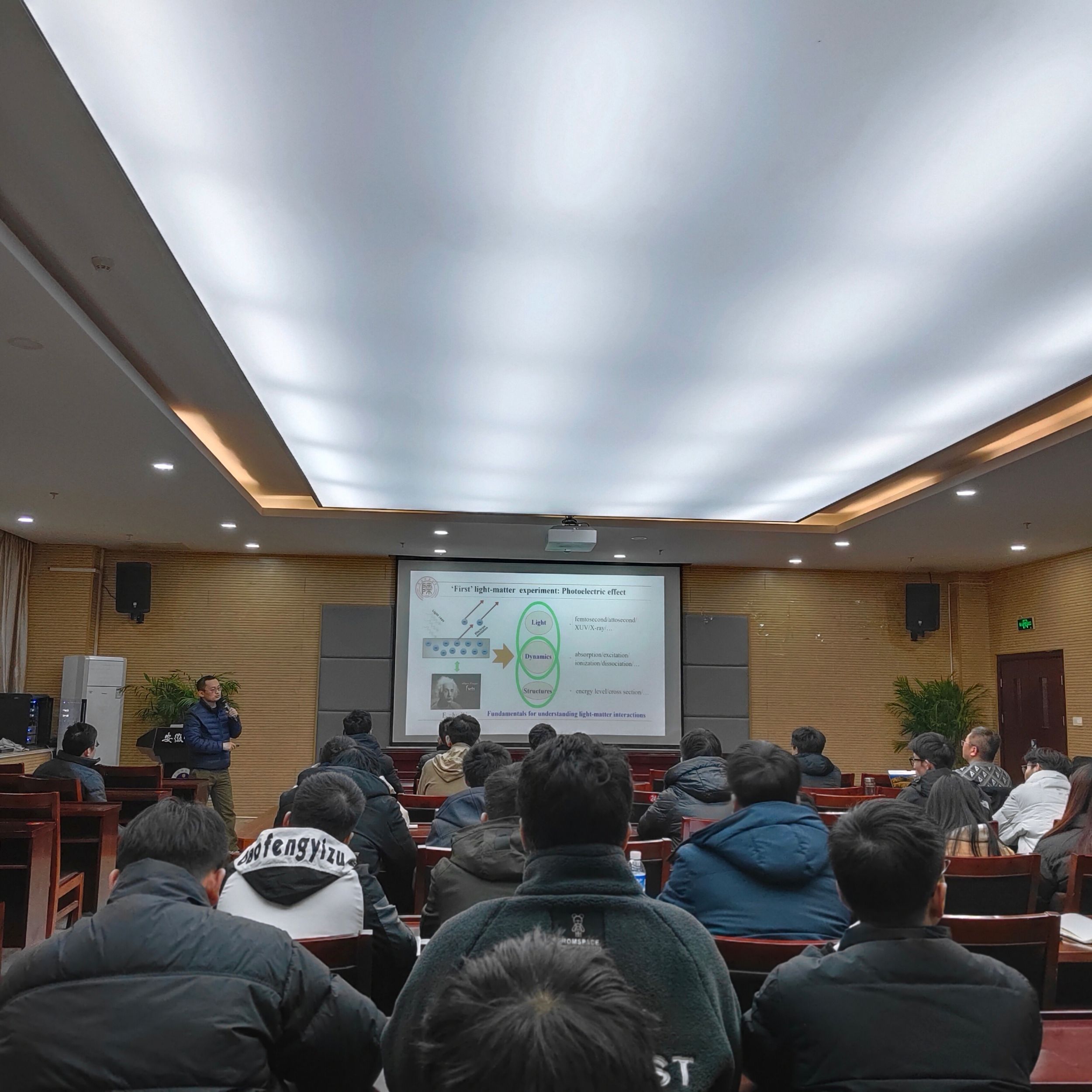 报告会上,张松斌教授简要介绍了自由电子激光、阿秒光源等当前最先进的紫外和X射线极端激光脉冲在物理、化学、材料、生命等众多领域和学科中的重要前沿研究和应用价值。会上,张教授结合相关工作同与会师生分享了课题组在紫外X射线极端脉冲与原子分子相互作用等方面取得的最新理论研究进展,包括自由电子激光脉冲驱动的分子解离动力学、原子分子辐射吸收光谱学、原子分子芯壳层动力学等。报告会结束后,与会师生就相关问题同张松斌教授展开了热烈讨论和交流。