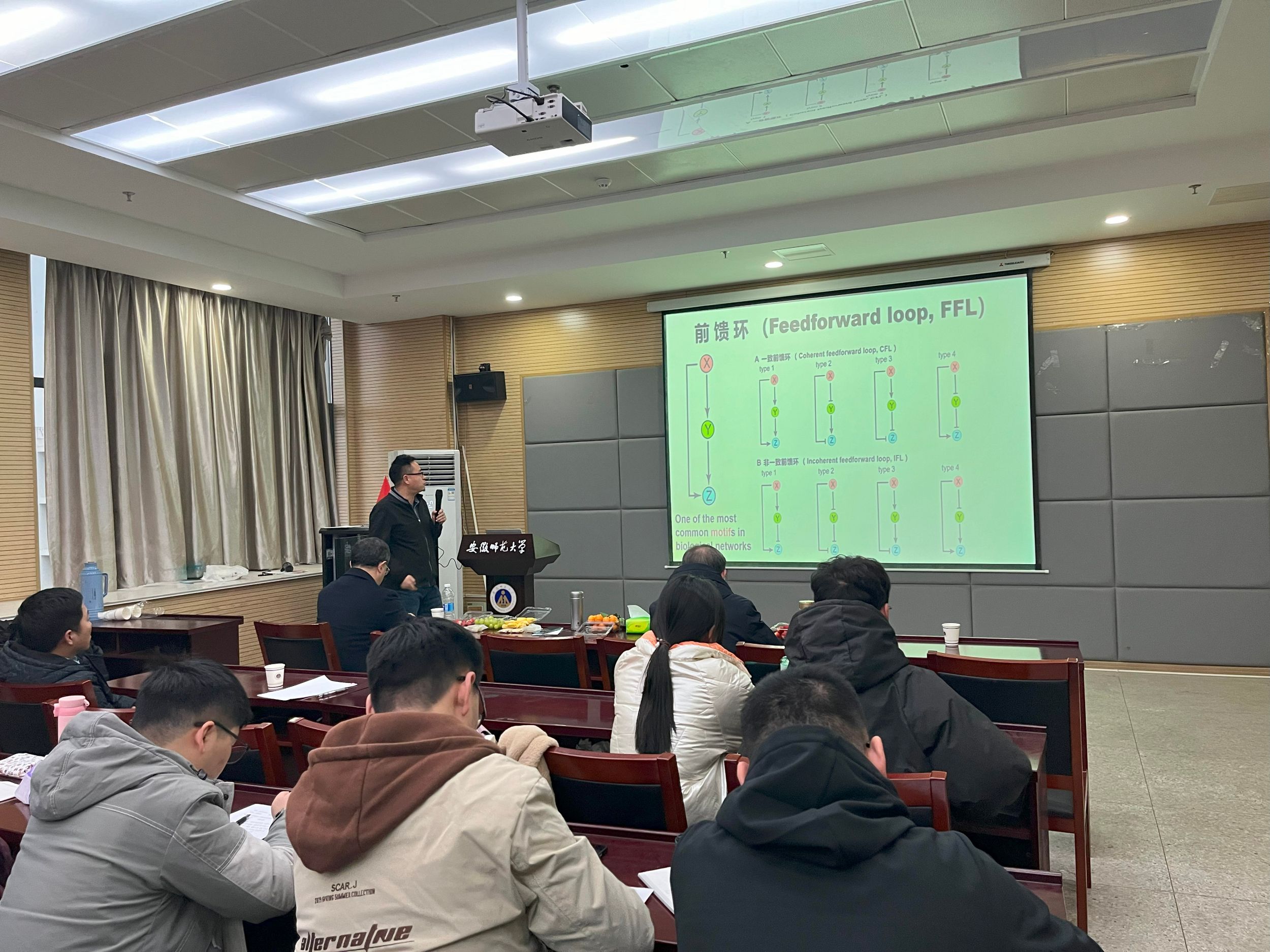 报告会上,祁宏副教授列举了生物系统中多稳态的例子,详细介绍了多稳态、前馈环与反馈环的种类和研究模型。会上,祁宏副教授结合相关工作同与会师生分享了课题组在前馈环与反馈环耦合网络多稳态行为研究方面取得的最新理论研究进展,包括根据构成多稳态的概率将729种拓扑结构分成五类,得出各类中不同正反馈回路个数所占比例,分别取给种类多稳态概率前50的拓扑结构,得出其公共的拓扑结构等。报告结束后,与会师生就相关问题同祁宏副教授展开了热烈的的讨论和交流。