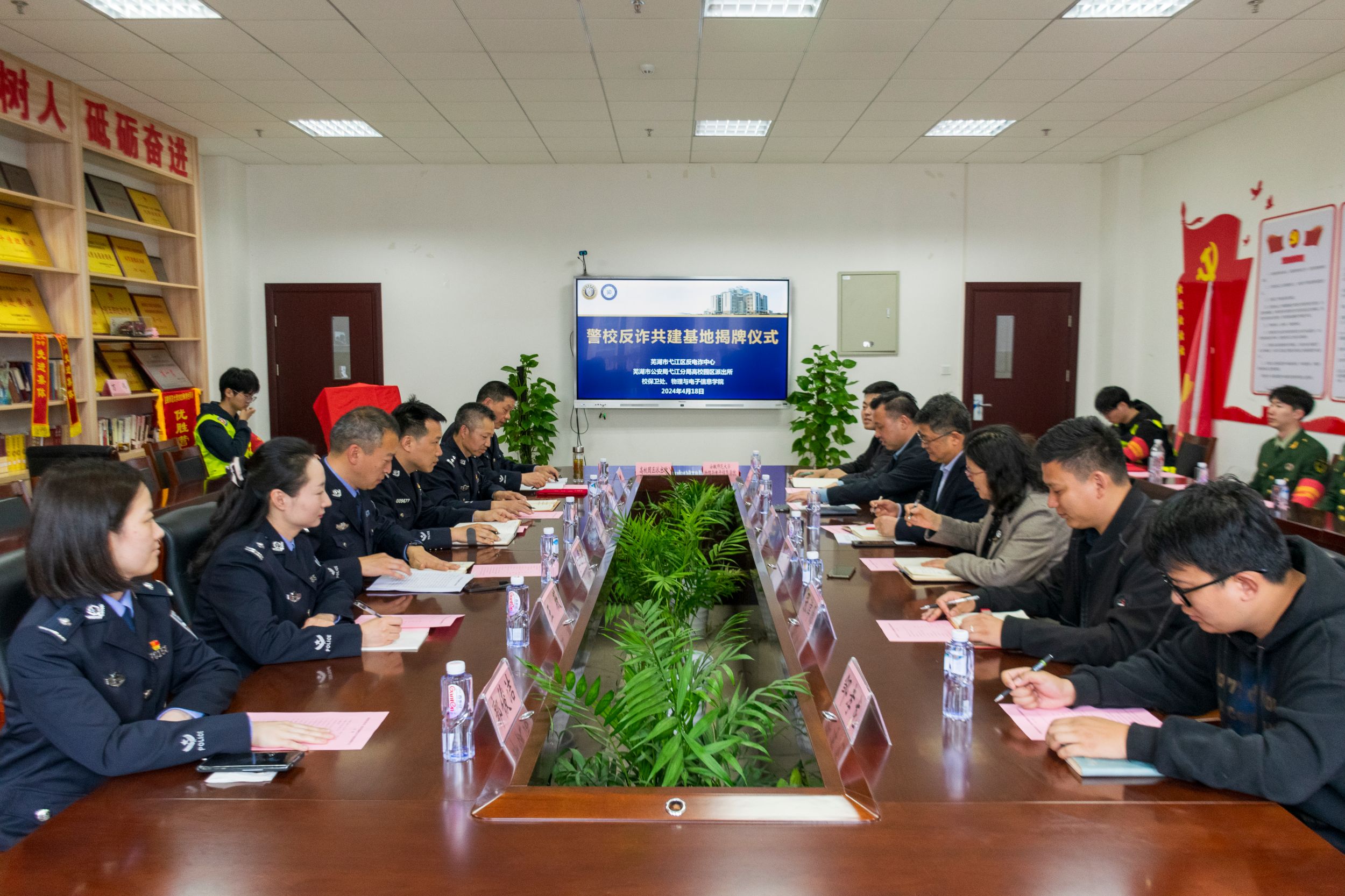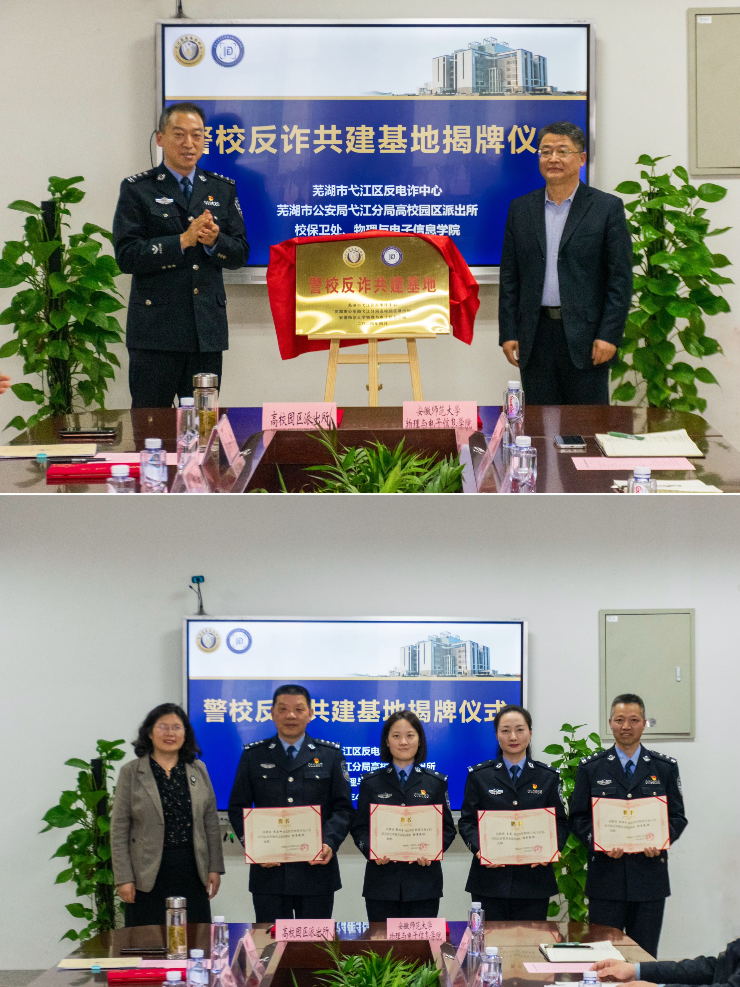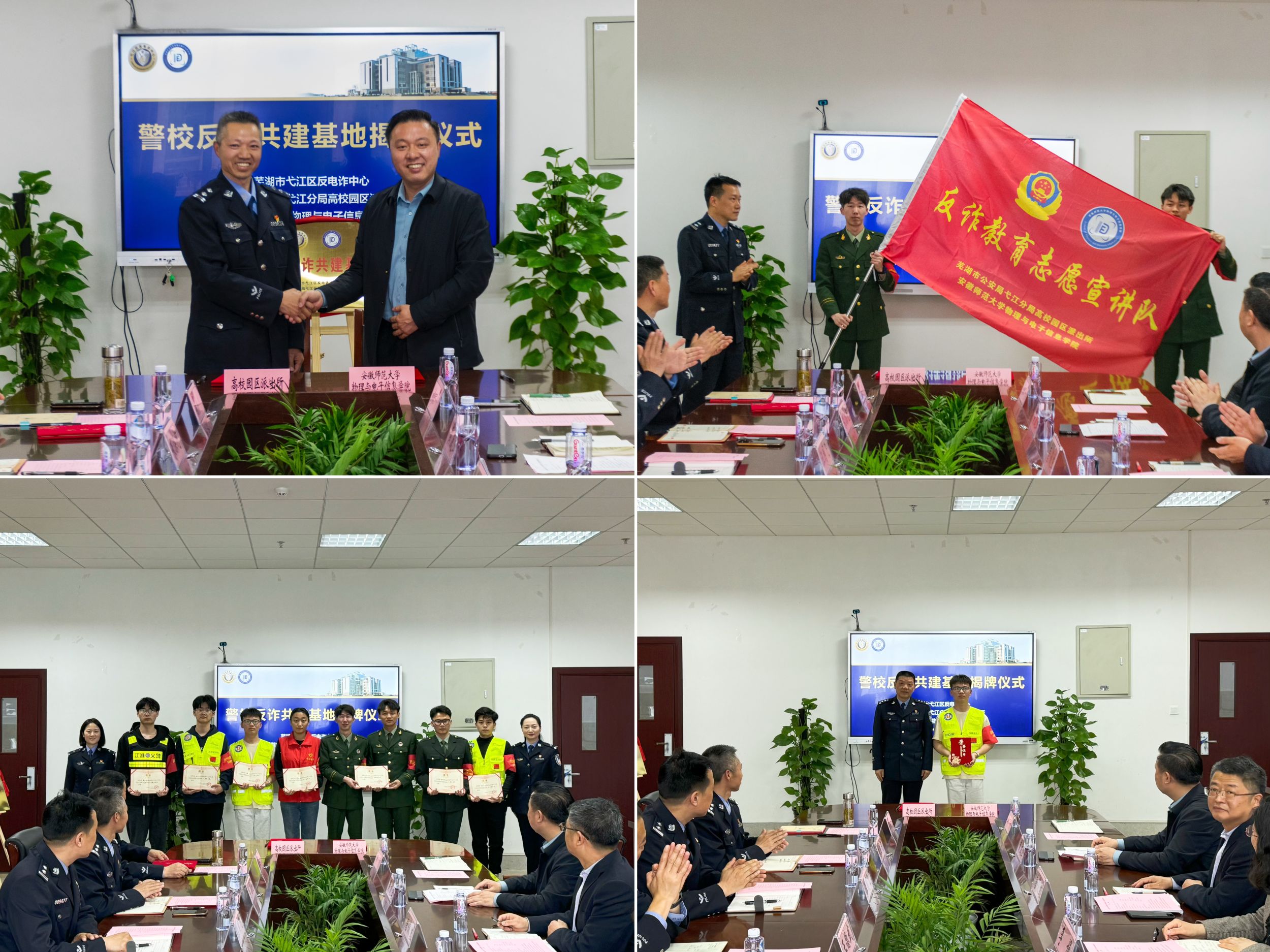 在物理楼308会议室举办了警校共建反诈基地揭牌仪式,高校园区派出所所长王德武,弋江分局综合打击队教导员汪国飞,高校园区派出所民警周英坤、朱滦河,弋江分局反诈中心王薇、郭俊洁,学校保卫处处长唐俊生,学院党委书记李娟,学院团委书记张津源及相关辅导员出席活动,学院反诈宣传教育志愿宣讲队成员参加活动。仪式由学院党委副书记黄友生主持。