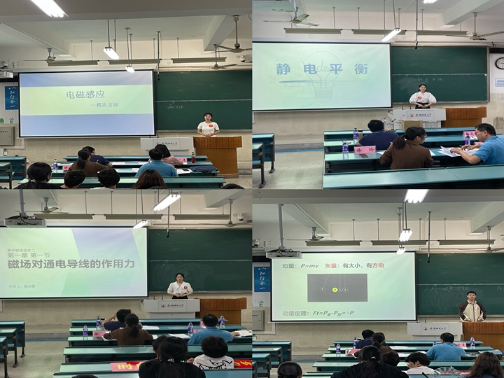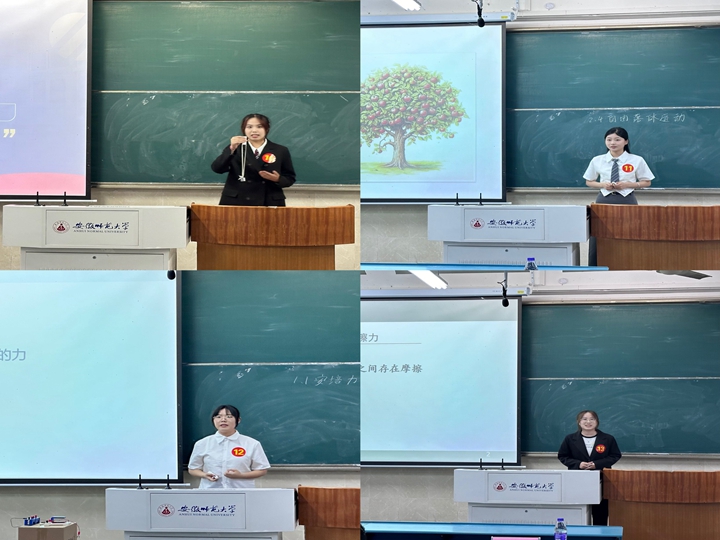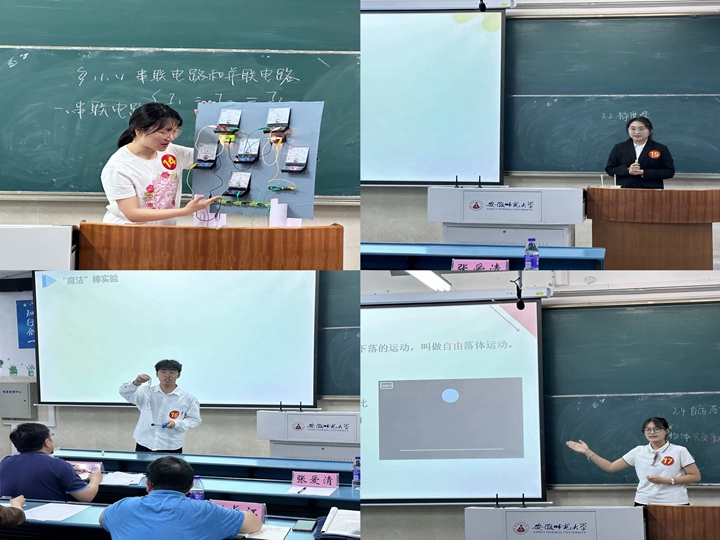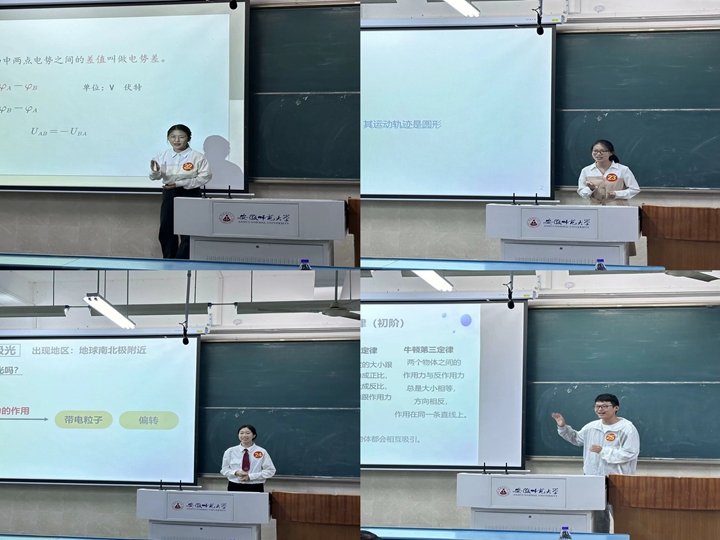 经过前期班级遴选,最终有25名选手进入院级决赛。在比赛现场,各参赛选手按照顺序依次进行模拟授课,分别采用现场试验、教学视频、师生互动等方法,开展了压强、力的合成、自由落体运动、弹力、声音的特性、自由落体运动、摩擦力、自由落体运动、电磁感应定律、圆周运动等课程的教学,带来了一场场趣味与教学并重的物理课堂教学,细致的内容和动情的讲解使现场师生仿佛置身在真实的课堂中。