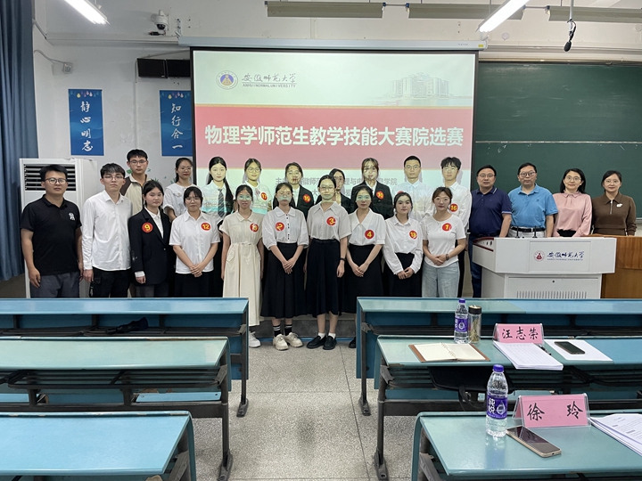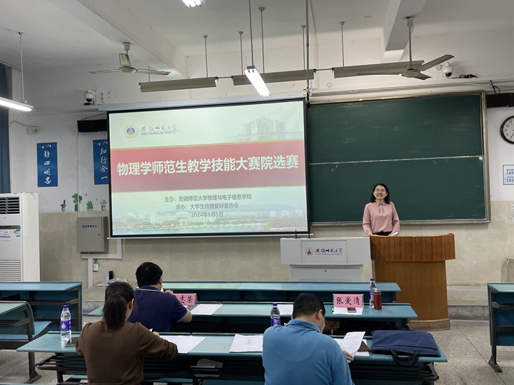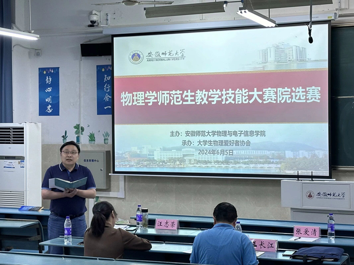 主办,大学生物理爱好者协会(以下简称“物协”)承办的物理学师范生教学技能大赛于6月5日下午在教学楼1号楼2010205教室举办。学院副院长张爱清出席并作赛前动员讲话,物理系副主任汪志荣,专业教师王长江、徐玲担任此次大赛的评委。比赛由物协刘天浩同学主持。