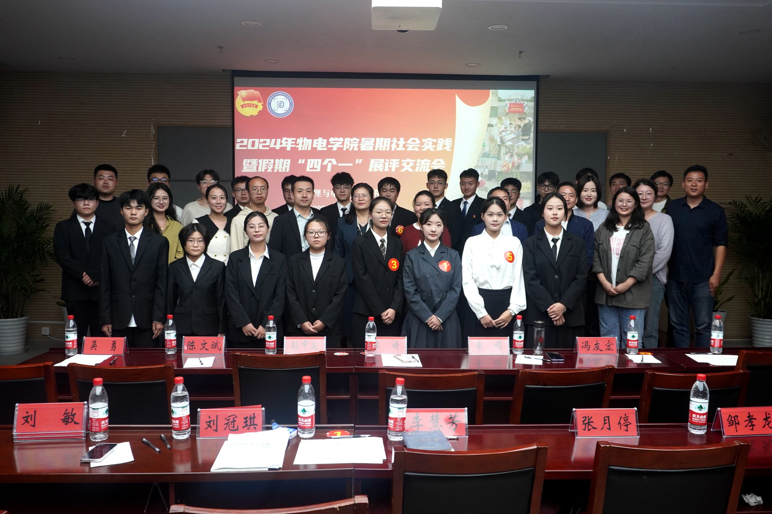 在物电楼304会议室召开2024年暑期社会实践暨假期“四个一”展评交流会。学院党委书记李娟,学院暑期社会实践思政指导教师、马克思主义学院李靖,通信工程专业负责人冯友宏,物理学专业负责人孙中发,学院专业课教师陈文斌、吴勇,以及学院本科生全体专兼职辅导员出席本次活动,各班级、实践团队学生代表到场观摩学习。