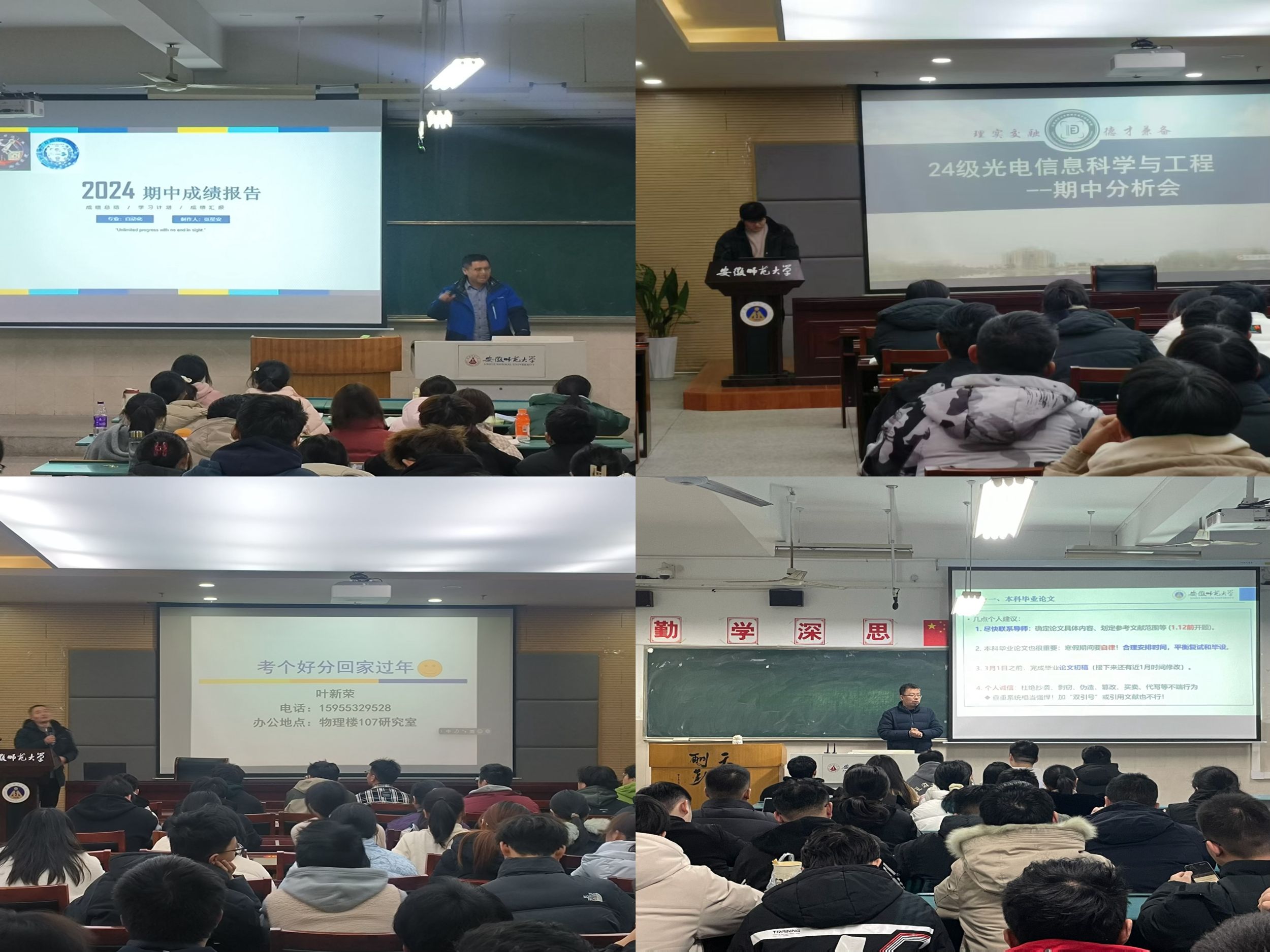 各班主任根据学院要求,经常深入课堂、宿舍了解学生的思想动态,就思想、学习、生活等方面与学生展开亲切交流,解决学生在思想、学习和发展中面临的各种问题,教育引导学生坚定理想信念、积极践行社会主义核心价值观、养成严谨求实的学习态度,争做有理想、敢担当、能吃苦、肯奋斗的新时代好青年。通过召开主题班会、培养方案解读分析会、物理学拔尖人才班“学术汇报”比赛、第一届“优师杯”讲课比赛、教育实习总结交流会、毕业论文和考研复试指导会,有计划地组织学生开展了解专业发展、培养专业兴趣的活动,在学业、学术科研、学科竞赛以及社会实践等方面进行针对性指导。