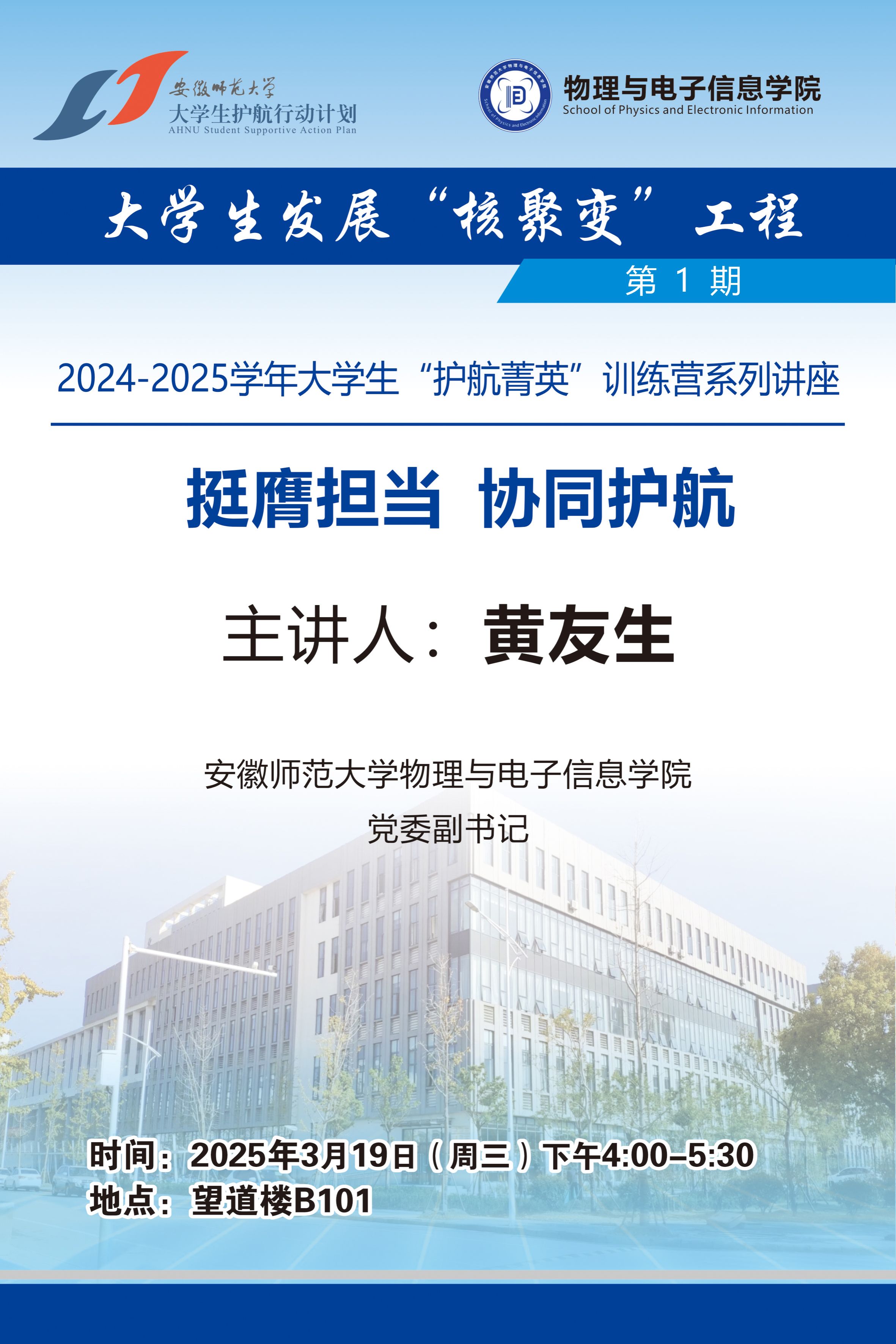 训练营第一讲,院党委副书记黄友生做了以《挺膺担当,协同护航》为题的专题讲座。他以“枫桥经验”“六尺巷工作法”为切入点,从大学生护航行动计划内涵是什么、为什么要实施大学生护航行动计划、大学生骨干应该怎么做等三个方面展开。他指出,全体学生骨干要深刻认识到自身肩负的护航职责,做到“六要六不要”,持续提升护航能力。他希望学生骨干要强化使命担当,发挥前哨探头作用,共筑和谐平安校园;要热心服务同学,发挥桥梁纽带作用,努力为同学排忧解难;要切实履行职责,发挥示范引领作用,营造积极向上的校园生态,让朋辈力量成为大学生护航行动计划的强力支撑。此外,黄友生还引用《一位部委司长对机关青年的忠告》等材料,从四个角度讲解了学生骨干的必备素养。