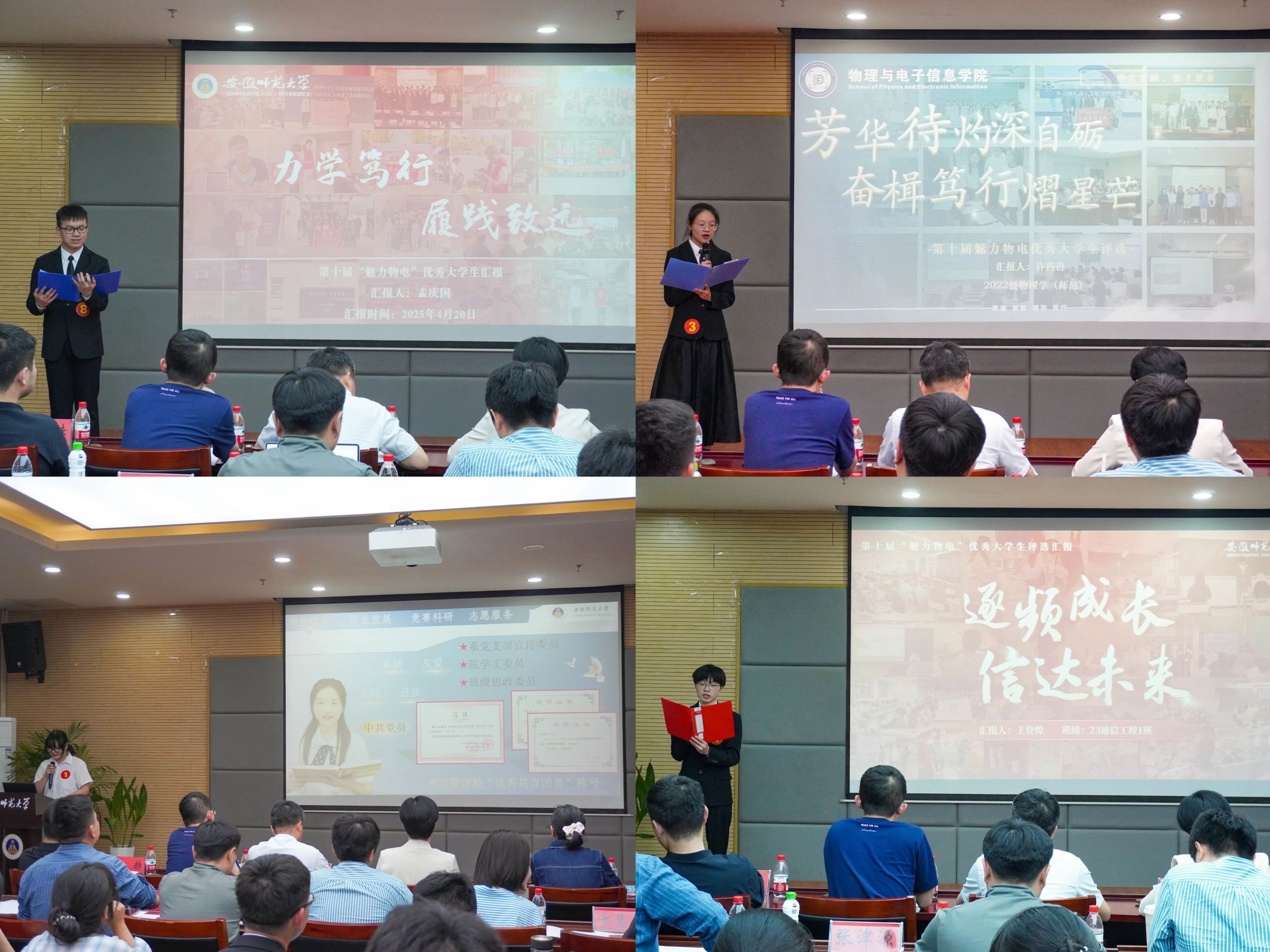 经个人申报、班级推荐、材料审核,共有17位优秀大学生进入到展评环节。他们采用PPT汇报的方式向与会人员讲述了自己在专业学习、科研创新、技能竞赛、志愿服务、社会实践等方面的历练与收获。学术道路上,他们如坚毅的攀登者,在知识的崇山峻岭间披荆斩棘;创新浪潮中,勇做无畏的弄潮儿,在未知领域破浪前行;公益征程里,化身温暖的火炬手,以所学点亮他人生活。一张张满载荣誉的PPT、一页页热血青春的成长记录、一句句激昂澎湃的奋斗誓言感染了台下的每一位评委和观众,勾勒出新时代学子的卓越风貌,展示了师大优秀物电人的样子,为广大同学树立了优秀榜样。