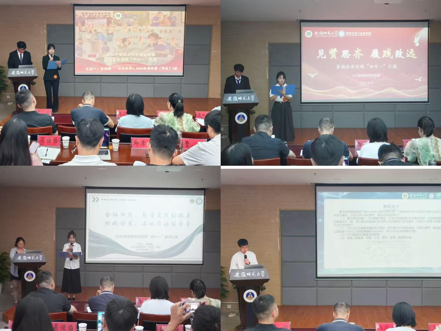 在物电楼304报告厅召开2025年暑期社会实践暨假期“四个一”展评交流会。学院党委副书记凌从祥,社会实践思政导师代表李靖,电子信息专业负责人甘露,专业课教师胡长生、杨凌云、张松、吴勇以及全体专兼职辅导员出席活动,各班级、实践团队学生代表到场观摩学习。