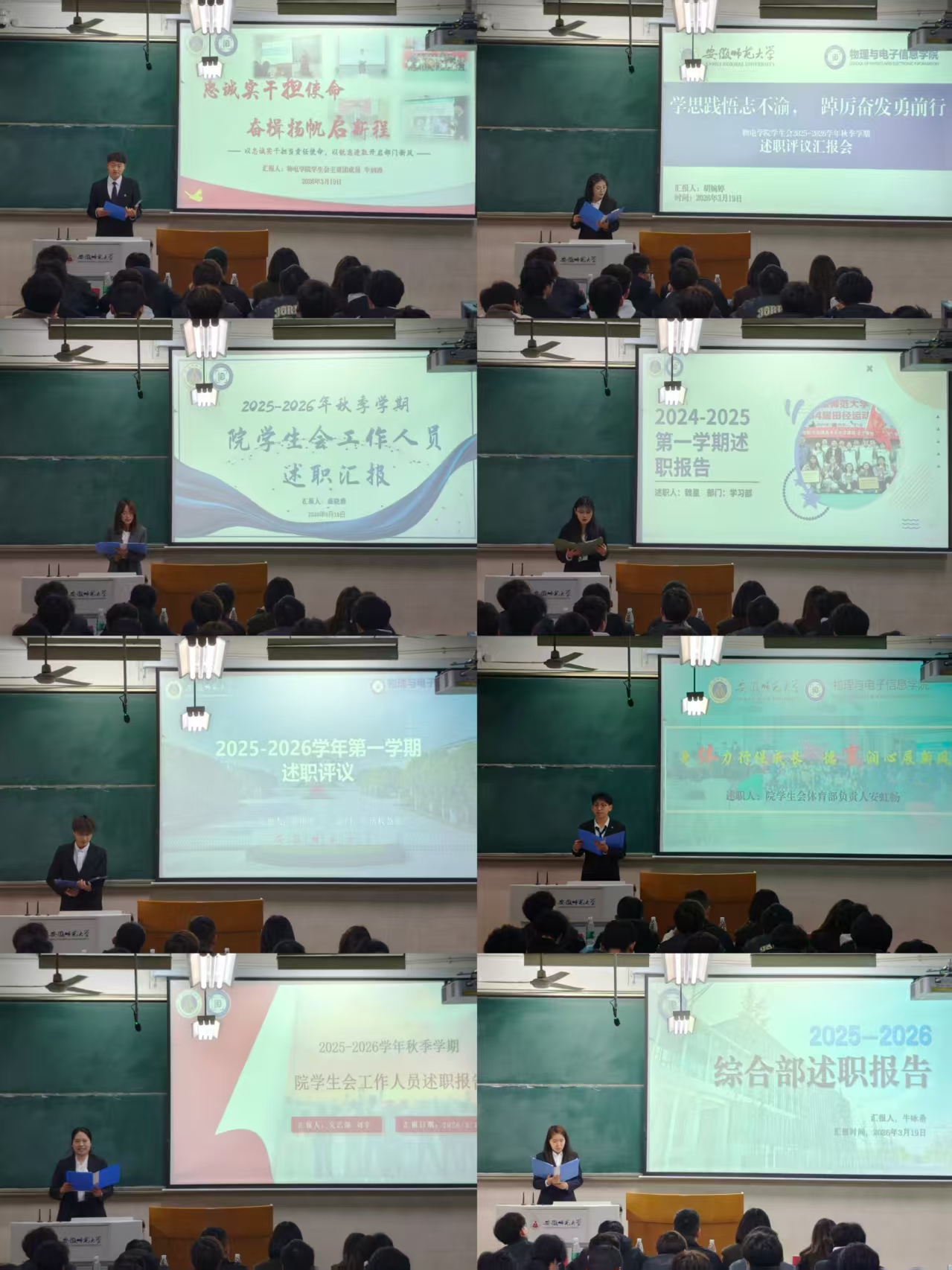 会议伊始,主持人李亮介绍了本次述职评议的主要流程及规则。随后,院学生会主席团成员、各部门负责人对照《安徽师范大学学生会工作人员述职评议工作办法》,结合上一学期的重点工作,围绕政治态度、道德品行、学习情况、纪律作风、工作成效等五个方面展开述职汇报,系统梳理了工作成果与经验反思,并围绕新学期工作目标提出明确规划。学院学生会主席团成员牛润涛在汇报中说要在学思践悟中精进个人本领、在履职尽责中强化工作落实、在反思总结中明确发展目标。院学生会体育部负责人安虹畅表示“只有在亲身实践中才能强化思想磁场、在学思砥行中才能彰显工作成效、在自我反思中才能推陈继往开来。”