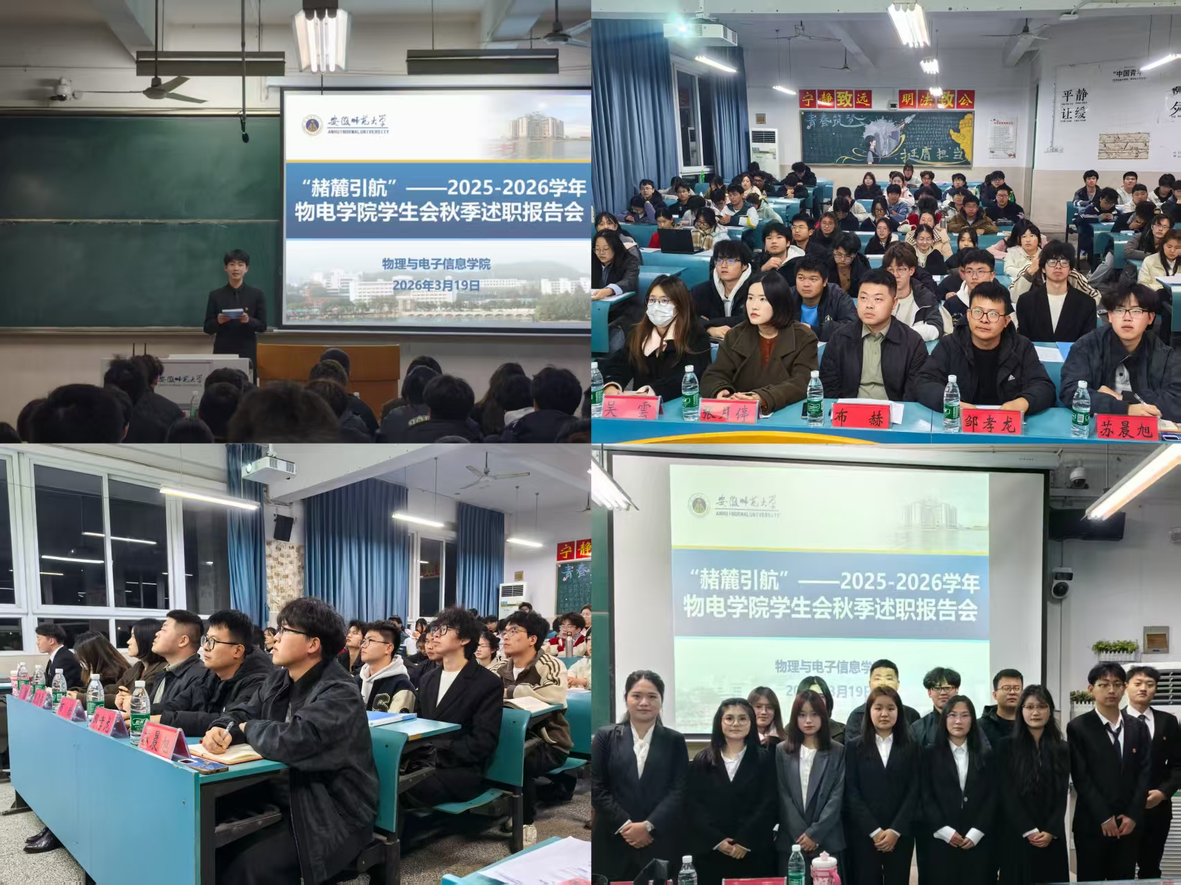 学生会2025-2026学年秋季学期工作人员述职评议汇报会在行知楼2号楼103教室顺利召开。院团委书记布赫老师、院学生会指导教师邹孝龙老师、电子爱好者协会指导教师张月停老师、校学生会代表苏晨旭、学院团委学生副书记吴雲出席汇报会,出席本次会议的还有学院学生会主席团成员、各部门负责人、院学生会全体工作人员、各班班长和学生代表。会议由学院学生会工作人员李亮主持。