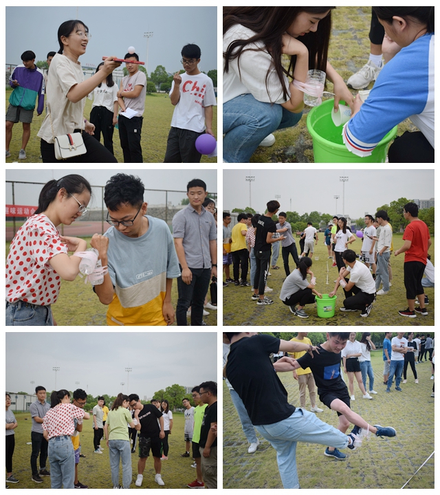 运动会上,选手们团结协助,燃烧激情,欢笑声、呐喊声不断。“萝卜蹲”比赛中,每队3名成员参赛,要求选手完成指定动作的同时,报出下一位接力者的代号,反应慢者则被淘汰;在“装模做样”这一环节,小组成员通过肢体动作将信息传递给下一位成员,动作表达时间不得超过1分钟,根据词语准确性累加分数;“身体传水”要求团队4人依次排好,在手臂、腿部系好空饮料瓶,通过装满容器的用时长短决出胜负;“仙人指路”则对团队指挥分配和团队协作能力有着极高的要求,团队中一人蒙眼过障碍,其余三人给出指示,中途失败需返回原点重新开始,用时最短者为佳。选手们在趣味运动中相互较量、交流、磨合,荣耀与共、无畏失败。趣味运动会的最终成绩将由主办方统计并于近期公布。