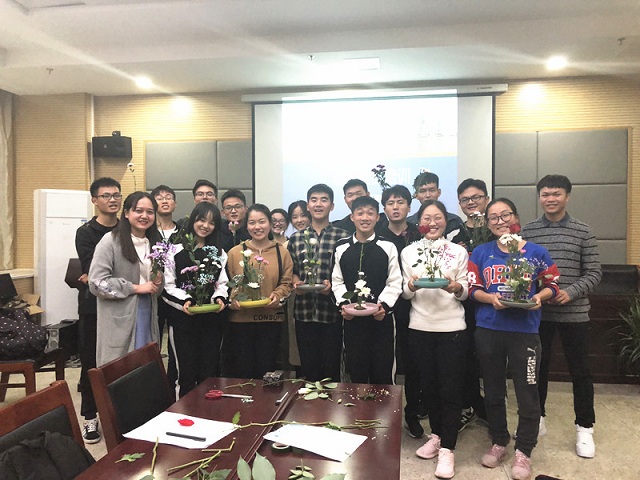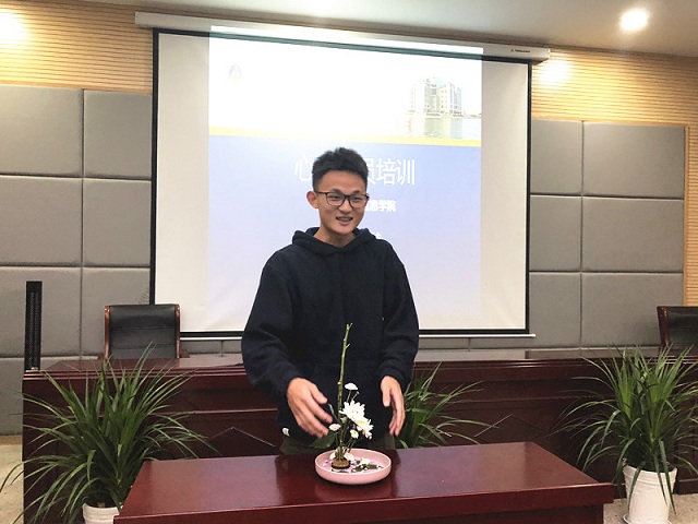 为了使大家对心理健康教育工作有更深刻的理解,除理论上的指导,聂余老师还给我们精心准备了一次插花体验活动。会前,学生会发展辅导部部员们准备好了鲜花、剑山等插花工具。学习完插花知识后,同学们分成了五组分别完成插花作品。他们不仅给自己的作品起了有趣的名字,还配以精彩的意义解说。经过投票表决,插花作品“简爱”赢得了此次插花活动“最佳插花作品”称号。至此,此次培训活动圆满结束。