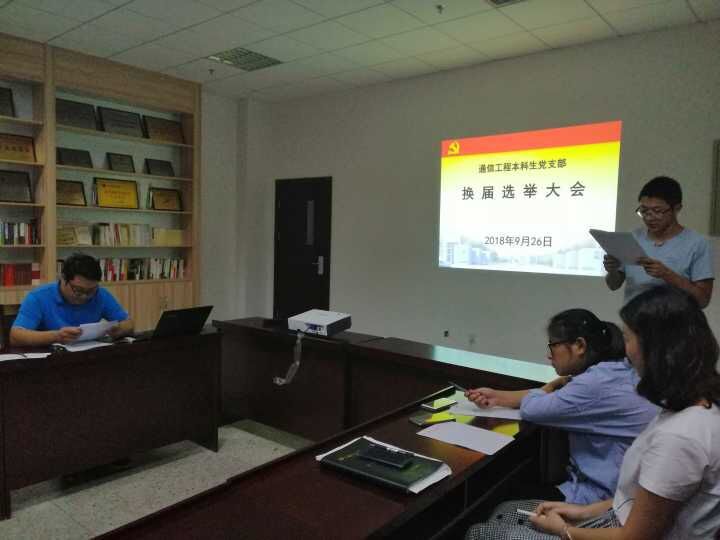 通信工程党支部在花津校区党员活动室召开支部换届大会,全体党员参加会议,会议由支部书记米佳佳主持。