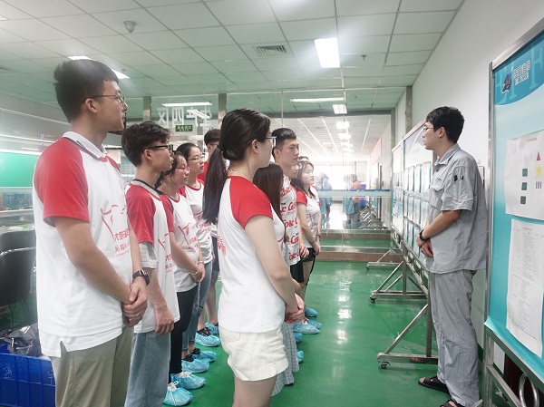 活动伊始,8号生产线张组长开了一个简短的会议,并介绍了该生产线双向双面安全指示灯的生产概况。他提出了详细的工作要求:在保证质量的前提下,提高数量。之后,产线负责人向实践团队演示了部分流程的具体操作,队员们都悉心听讲,并在短时间内掌握了操作的规范技术。