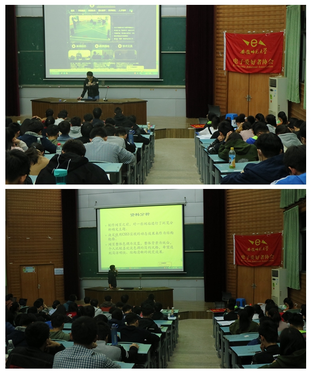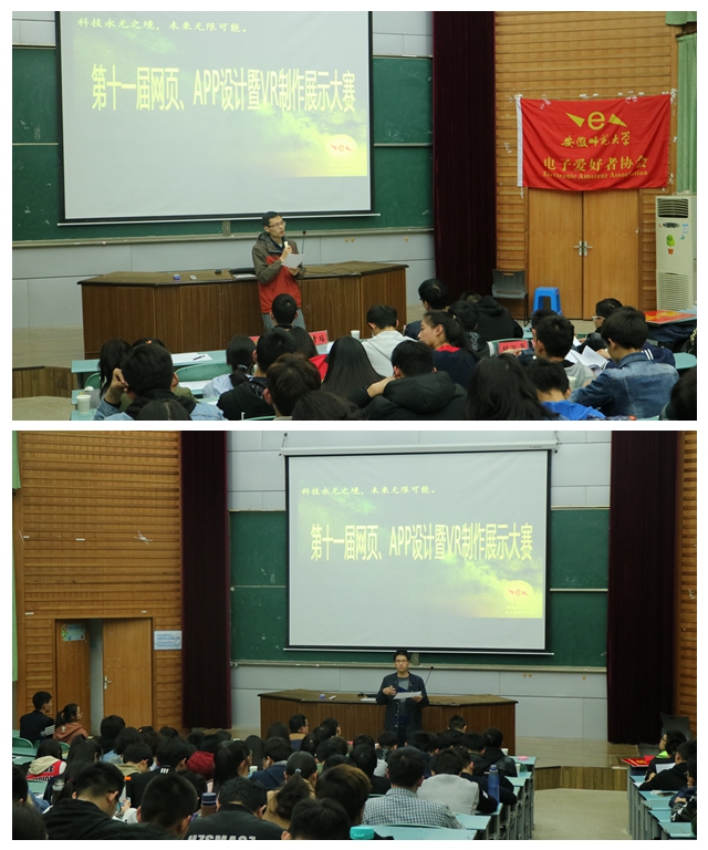 团委书记宋凤楼、电协指导老师许晨晨出席本次大赛并担任评委,到场观看决赛汇报的还有电子爱好者协会全体理事、17级学生代表、校社联学生代表共计两百余人。本次活动针对全校学生展开,鼓励学生参与和制作网页、APP和AR技术,增进学生之间关于网络、APP和AR的技术交流。
