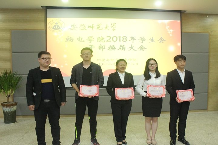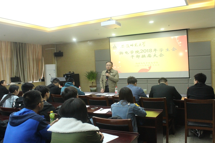 2018年学生会干部换届大会于物理楼301成功举办。院党委副书记吴长义,团委书记宋凤楼,辅导员汪光麟、米佳佳、许晨晨、实习辅导员戴昶春以及院团委、学生会成员共同出席了会议。此次大会由张杰老师主持。