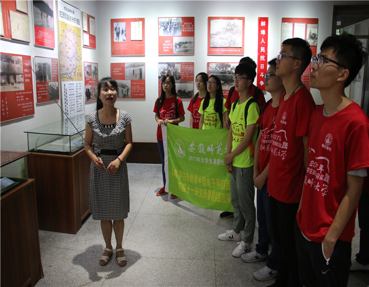 7月1日上午,团队一行13人来到位于蚌埠市龙子湖区的烈士陵园,在庄严肃穆的纪念碑前,全体队员面对鲜红党旗,举起右拳,正容亢色地宣读入党誓词,宣读完毕后。全体队员参观了蚌埠市革命历史陈列馆,瞻仰了蚌埠市在抗日战争期间的革命历程,了解英雄故事。在解说员生动地讲述下,队员们对革命烈士肃然起敬,对来之不易的和平生活无比珍惜,墙上的“革命烈士永垂不朽”八个大字深深触动每个人的心灵。