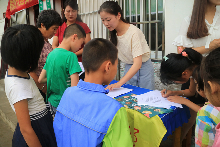 的同学们来我校爱心支教。”我们感受到了他们对我们的欢迎。渐渐的很多家长带着孩子们来到了学校,在进行招生活动,经过教长时间的宣传介绍,学生以及家长们对此次活动有了更详细的了解,大家热情支持并积极报名,此次报名活动圆满结束!
