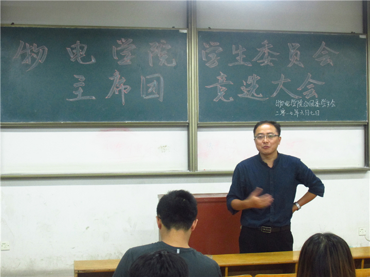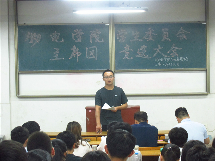 2017年学生会主席团竞选大会成功在物理楼3202教室举行,参加此次会议的领导老师有院党委副书记吴长义,团委书记米佳佳,学生会指导老师宋凤楼以及2016级辅导员蒋婷婷、秦瑾琼,全体学生会成骨干观摩了此次竞选大会。