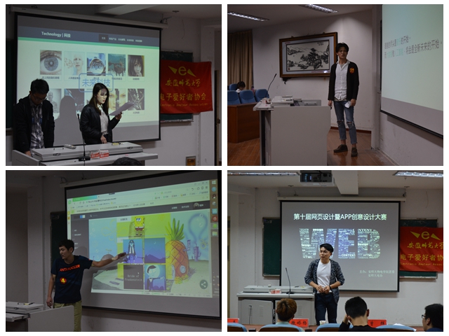 本网讯(电子爱好者协会)春暖花开,万象新。2017年4月23日7:00点电子爱好者协会在综合楼三楼大会议室举办了第十届网页设计暨APP设计大赛,此次大赛的主题是科技创新,启航未来担任此次决赛评委的有曾经的物电校友、现任乐游网络技术有限公司的产品经理曾辉,校社联主席撒娇杨,物电院学生会科技部部长解杰,计算机爱好者协会会长张仕超,电子爱好者协会副会长张钒、罗羊。