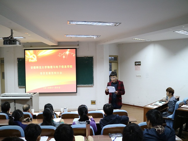 2014级本科生党员发展答辩会在行政楼三楼会议室举行。此次答辩会评委有学院党委书记李娟老师,退休党支部书记陶绪德老师,党委副书记吴长义老师,统战委员郑贤锋老师,党委秘书王梦晓老师,各学生党支部书记和学院学生党员、入党积极分子代表。答辩会由光电支部书记汪光麒主持。