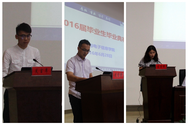 毕业典礼在雄壮的国歌声中拉开序幕。院长崔执凤致辞,他充分肯定了同学们四年来所取得的成绩,并真情嘱托大家,面对未来要学会融入社会、学会面对困难、学会呵护心灵,积极进取,勇敢迎接挑战。之后,全体与会人员一起观看了由毕业生拍摄的短片《毕业说说》,重温了2016届学子在学院成长的美好时光,教师代表、辅导员、毕业生代表、低年级的学子们均道出了自己内心的真情与感受,祝福、期盼、感谢与感动汇聚在《毕业说说》之中,成为师生们永远无法忘怀的回忆。教师代表王元航分享了自己的求学故事,用自己的经历向大家阐述了师生情、同学情的弥足珍贵,并希望毕业生们今后继续努力,更上一层楼。低年级学生代表王勇致欢送词,感谢学长学姐的帮助与指导,祝福他们前程似景。蔡文君和宋凤楼分别作为毕业班的本科生和研究生代表致答谢辞,他们回顾了自己在校的学习经历,感谢校院领导老师的培养和教育。最后,学院领导向毕业生代表颁发了毕业证书和学位证书。