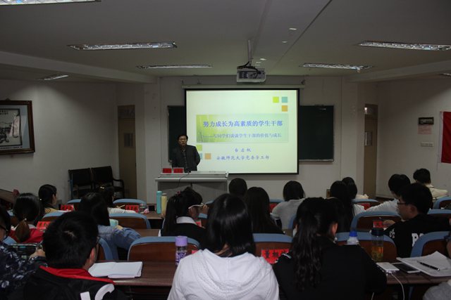 分党校)4月17日,校党委学工部部长、学生处处长台启权老师应邀为学院党校、团校培训班讲授《如何成为高素质的学生干部》主题报告。辅导员徐玲老师、全体党校学员、学生会、各年级学生骨干代表出席了本次报告,报告由党校副班主任李亚主持。