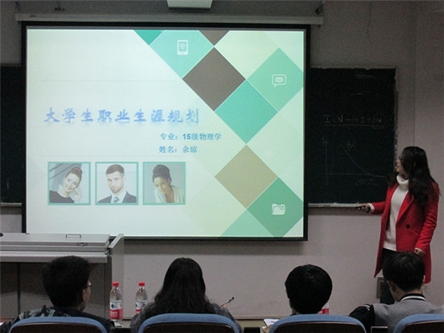 各位选手均是15级的大一同学,他们分别从自我认知,职业认知,目标路径设计以及调整评估等四个方面对自己的未来职业生涯进行了规划。经班级推荐、学院审核,最终有12位选手进入决赛。决赛现场,选手们结合精心制作的PPT,联系家庭、学校、社会三个环境层面进行深入分析,条理清晰,目标明确。15物理余琼运用专业SWOT分析方法,由点到面分析自我,规划成为一名物理老师的路径;15电子阕庆云励志考北京邮电大学的研究生,赢得在场评委的大力支持。他们的精彩展示赢得现场热烈掌声。最终,吕永雪,余林等同学分别荣获一、二、三等奖。