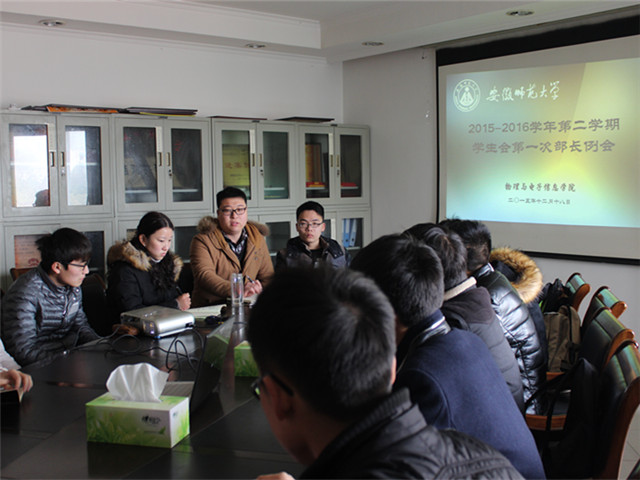 学生会2015-2016年第一次部长例会,参加会议的有指导员米佳佳老师、学生会主席团、各部门部长。