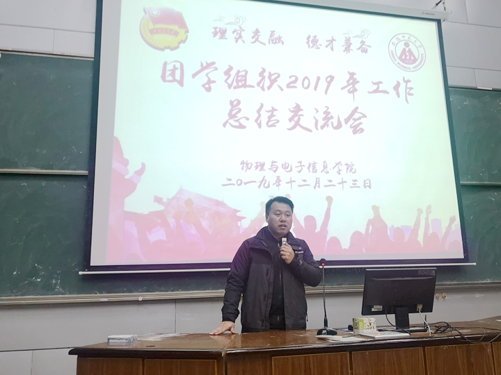 本网讯(院团委 新媒体中心)23日晚,学院在行知楼2010105教室召开2019年团学组织总结交流会。院党委副书记黄友生,工科实训中心主任、电子协会专业指导教师蔺玉柱,发明协会专业指导教师周正仙,院团委副书记甘露、全体本科生辅导员出席会议,学院团委、学生会、电子协会、发明协会全体成员参加交流会。会议由学院团委书记宋凤楼主持。