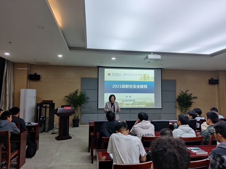 2021级电子信息类全体学生在物理楼304会议室开展安全教育培训会,学院党委书记李娟和实习实训中心主任蔺玉柱主讲。