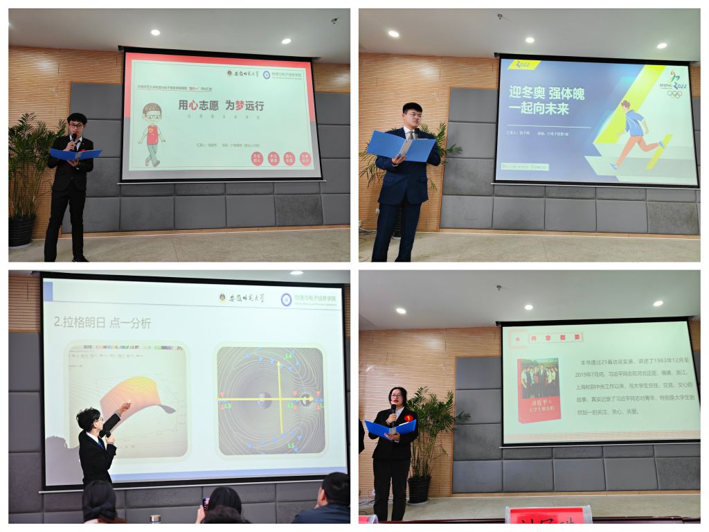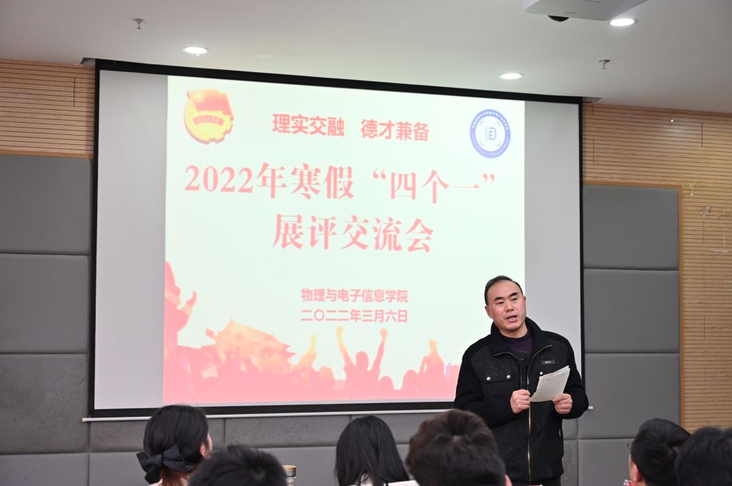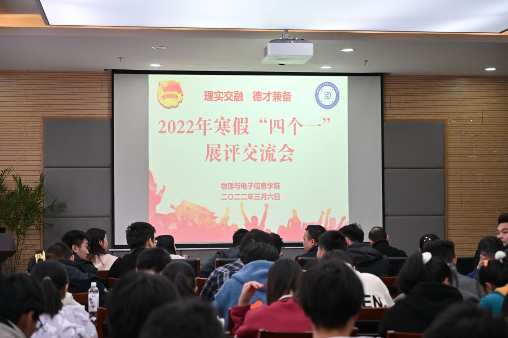 在物电楼304会议室举办“逐梦暖冬·乐享寒假”社会实践暨2021-2022年寒假“四个一”展评交流会。学院党委副书记黄友生、物理专业副教授汪志荣、工科实训中心主任蔺玉柱及学院全体专兼职辅导员担任评委,2020级、2021级部分学生代表到场参会观摩学习,评比汇报会由院团委委员宣灵婕主持。