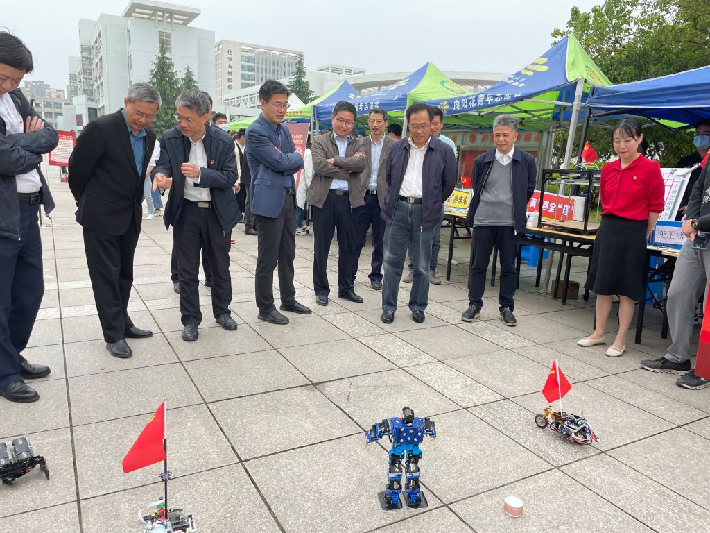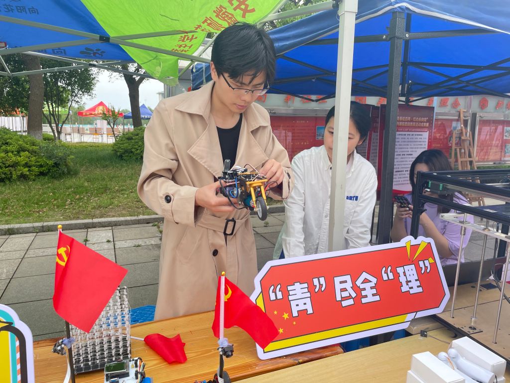 活动现场展示主要包括四旋翼、智能车、光立方、3D打印机等作品。其中,电子爱好者协会的舞蹈机器人在原创代码驱动下,根据《党是太阳,我是花》歌曲音乐律动自动挥舞身体躯干,吸引了大批同学的驻足;学科竞赛团队以创造创新为目的、自主设计和研发出的能制作智能车、四旋翼等电子设计作品的3D打印机,在现场逐层打印出“建团百年”的立体模型,让科技作品迸发出红色教育的新风采;2019级张哲川创作的远距离输电演示仪通过学生电源、可拆式变压器、小灯泡模拟出实际生活中的发电站、变压器以及家庭用电,该作品已获得安徽省双百大赛二等奖,该同学立志扎根祖国乡村,他表示制作教具的过程虽然辛苦,但是以赛促学,帮助了他扎实理论知识、练就师范生技能,有助于以后为偏远地区的孩子们带去更多科学之光;51单片机diy电路经过志愿者的演示讲解,为老师同学们依次呈现出团徽、红心、1922-2022年等图样,完全实现了录音播音等多样功能,将青春的头脑风暴与科普的成果展示有机结合,让作品既有科技底蕴,也有育人内涵。活动现场气氛热烈,一件件“铁萌”的科普展品,一段段“硬核”的精彩演示,吸引了众多学生和老师观看,科技作品的魅力无限散发,强国志报国行的信念入脑人心。