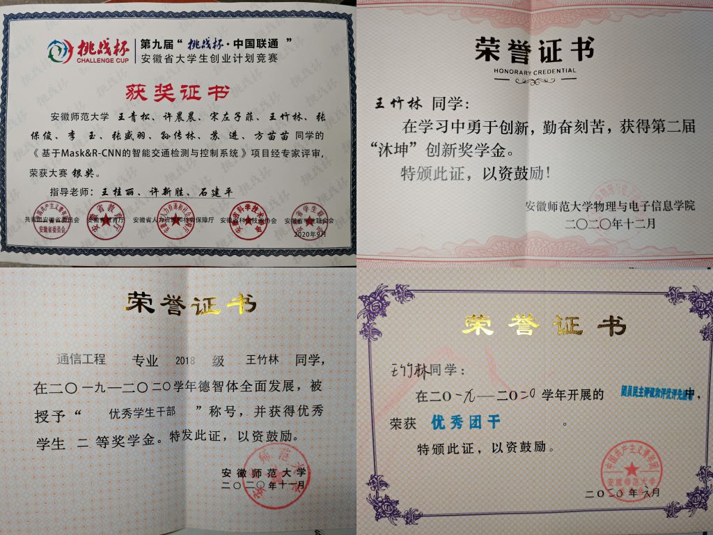 在过去师大的成长经历中,王竹林认真学习专业知识,积极参加学科竞赛和素质拓展活动。她先后获得三次校二等奖学金、一次校三等奖学金、“沐坤”创新奖学金、“优秀团员”、暑期社会实践“先进个人”、“挑战杯”竞赛安徽省银奖、“中国创翼”创新创业大赛芜湖市二等奖、Office技能大赛校一等奖、“金苹果”科普知识竞赛二等奖、426专利知识竞赛三等奖、“青春创意秀”大赛校级银奖等一系列奖项和荣誉称号。在追梦的道路上,她始终不曾停下脚步。