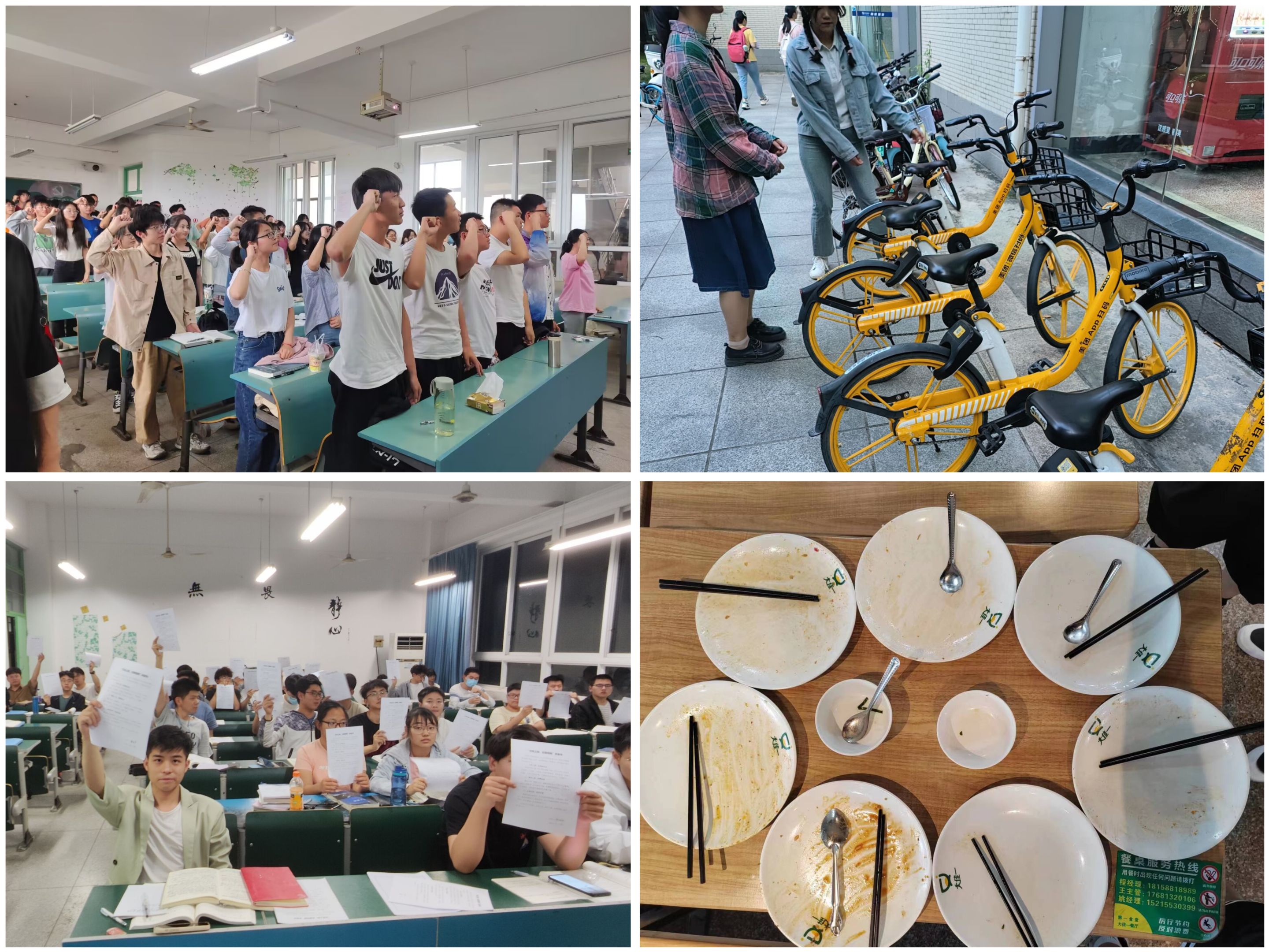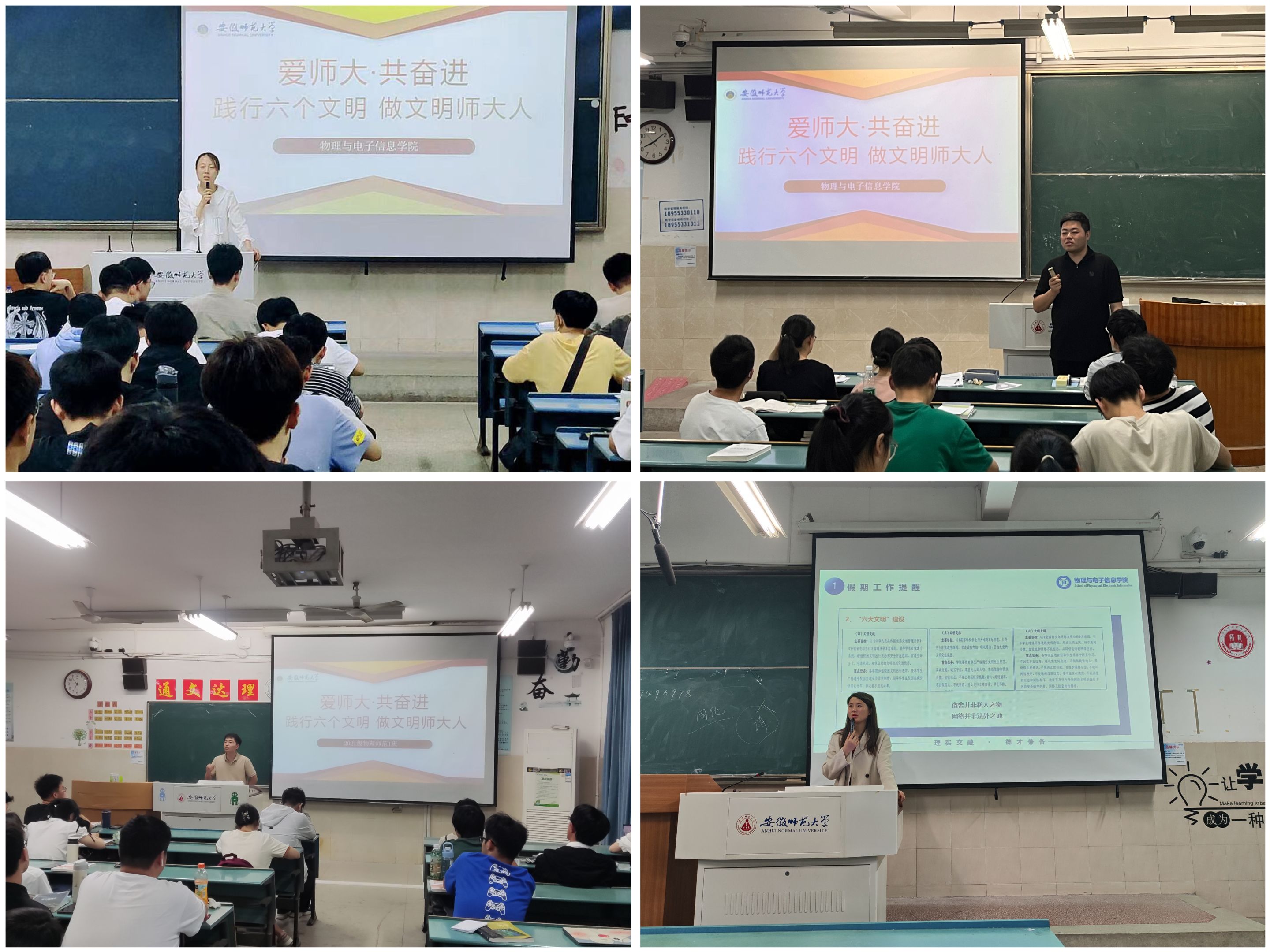 通过“四个一”行动扎实推进“六个文明”教育实践活动。一次主题班会,各辅导员深入班级召开文明修身主题教育班会,引导学生从身边做起,从小事做起,培养文明习惯和修身意识;一次承诺践诺,签署《网络文明承诺书》,引导学生增强网络自律意识,积极传播正能量、主旋律,争做校园好网民;一次劳动实践,发起“明亮教室”“整洁宿舍”“光盘行动”“规范出行”主题活动,引导学生以实际行动展示师大人的样子!一次宣誓仪式,组织学生开展“爱师大,共奋进”集中宣誓仪式,引导学生积极投身“六个文明”教育实践活动,做文明校园创建的主人翁、践行者和监督员。