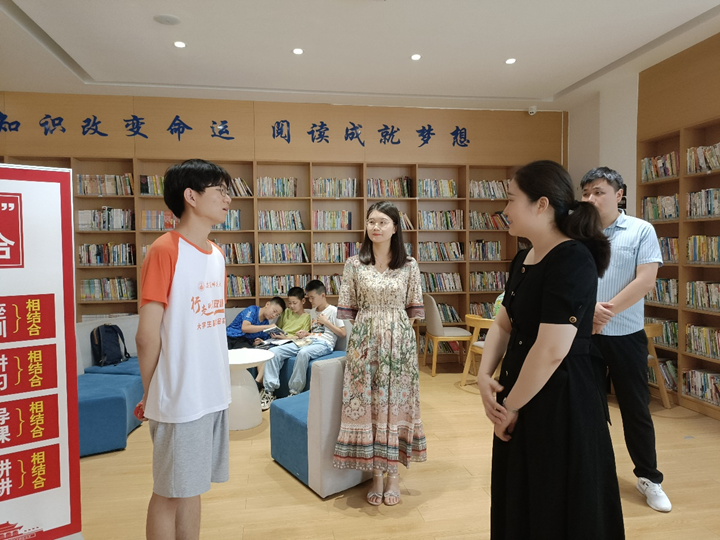 在少儿图书馆内,团枞阳县委一行人与支教团队负责人进行座谈交流,主要从三个方面进行。首先,团枞阳县委书记、团枞阳县委副书记一行详细询问了团队队员这些天的工作和生活情况,就支教活动的开展实施、支教工作的成果、支教预期目的等方面展开深入交流。团枞阳县委书记充分肯定了千方爱心团队队员们这一周以来的教学成果,赞扬了安徽师大爱心支教团队在实践中吃苦耐劳、无私奉献的优良品质,并且对千方爱心支教团队对枞阳县教育事业的贡献表示感谢。其次,团枞阳县委书记表示,非常欢迎安徽师范大学爱心支教团的到来,炎炎夏日,安全问题始终是第一位的,嘱托队员们要注意夏季防暑,保障自身安全,做到安全支教。最后,她勉励队员们继续保持良好的教学状态和认真负责的工作态度,助力枞阳孩子成长,为枞阳孩子树立一个无私奉献、具有社会责任感的青年教师形象。
