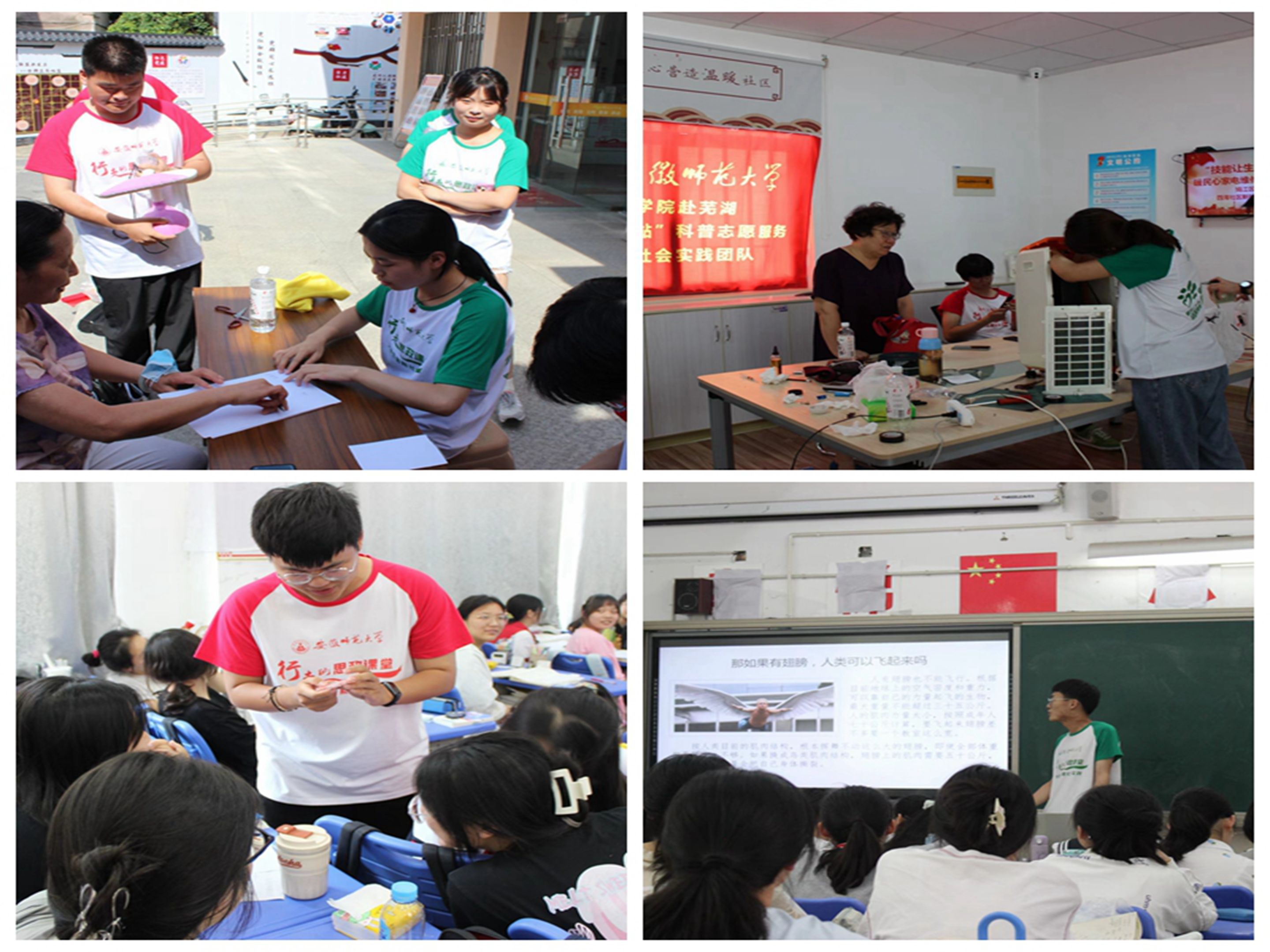 用爱宣传,将科普知识传进社区。“奶奶,启动电风扇时要先选择快档,用慢档电压启动速度慢,不仅耗电多,还影响风扇使用寿命嘞!”“社区科技站”科普志愿服务实践团队中“金苹果”科普宣讲员为一位老奶奶修好电风扇后提醒道。每一次的家电维修过程中,实践队员们都会向居民再次强调一遍电器的安全使用事项,讲解电器维护保养小技巧,空调频繁开关对机器损害大也更耗电、观看电视时开一盏小灯可以缓解疲劳、热水壶不宜和其他大功率电器同时使用避免跳闸.....“志愿者们教授的那些医疗卫生知识特别有用,他们不仅教会了我们大人这些急救方法,还采用趣味游戏带着孩子们一起学,孩子们遇到危险能够自救,我这心也踏实不少。”科普队员们每周按期走进社区,在居民中普及急救知识,教授心肺复苏、常见意外伤害现场救护等方法,提升居民应急救护能力;开展结核病防治宣讲和环保公益宣讲,帮助居民树立安全卫生意识,共创绿色环保生活环境;为社区孩童开展科普讲座,通过趣味实验寓教于乐,带领他们了解日常科学知识,在生活中富有探索欲和求知欲。“大哥哥大姐姐你们什么时候再来带我一起做物理小实验呀?”几周的社区实践,团队深受社区孩童的喜爱,收获了居民们的一致好评,大家对志愿者们的奉献纷纷竖起大拇指,欢迎他们再次到来。