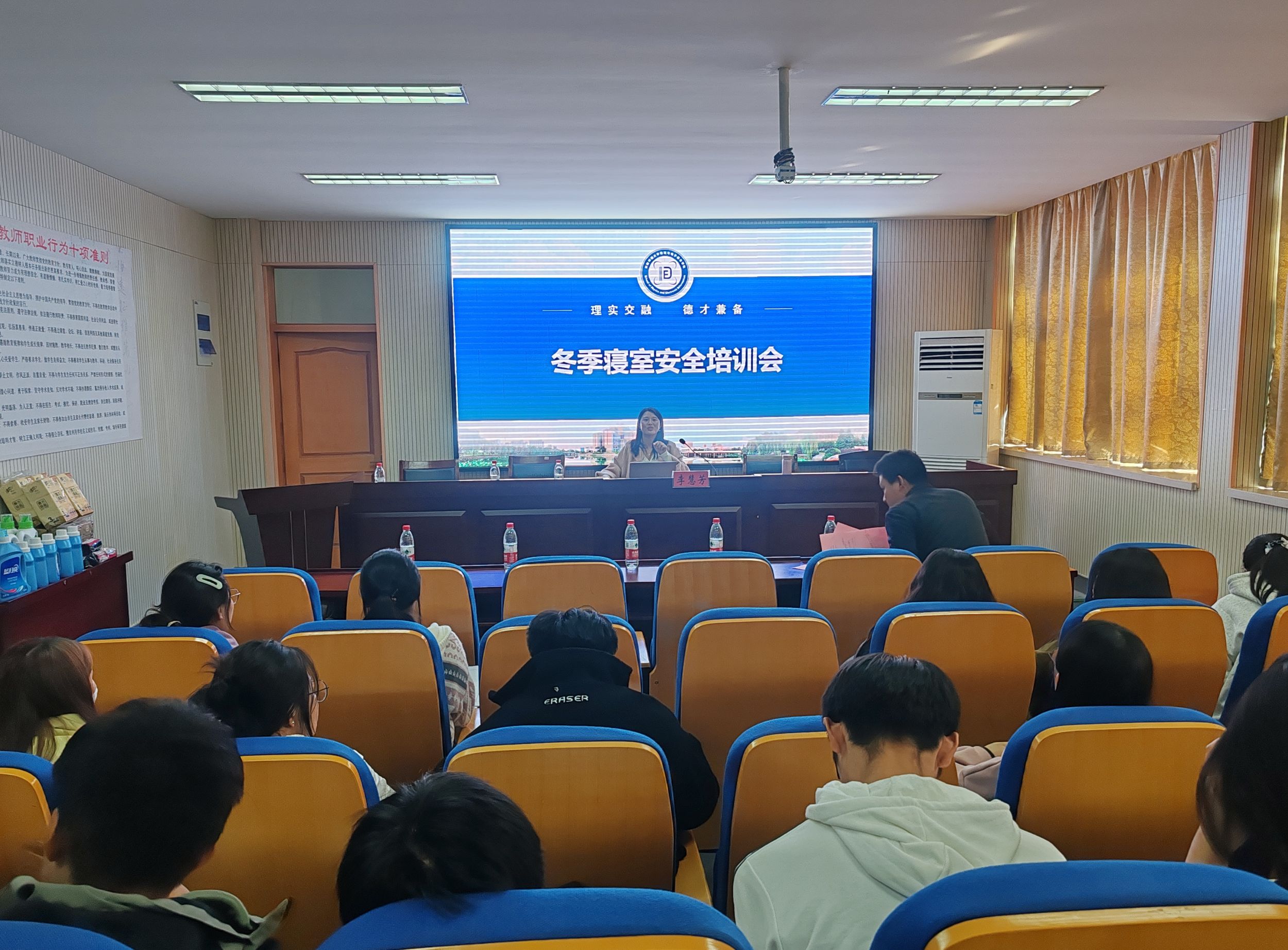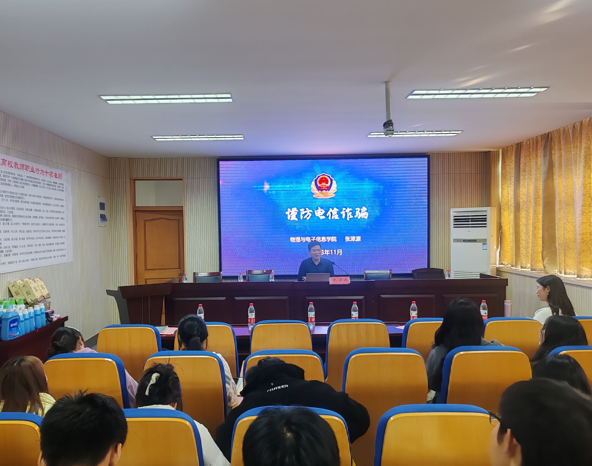 院团委书记张津源,辅导员李慧芳为学院各年级生活委员、楼层长、寝室长作安全教育辅导报告。张津源以“谨防电信诈骗”为主题,从电信诈骗的定义、发展特点、常见手段以及防范措施四个方面,为大家筑牢反诈防诈保护墙。其中关于防范措施,他着重强调大家要做到“三个不”“两个建议”“一个核实”,始终树牢防范警惕意识。李慧芳围绕寝室安全问题,以身边常见的寝室安全案例为切入点,为大家解读了寝室消防安全、财产安全和身心安全的重要性,并现场演示了灭火器的正确使用方法。她指出,寝室是学生成长的最小单元,是学校育人的基本阵地,大家务必牢牢把握“安全第一”的理念,切实将维护寝室安全落实在日常生活的方方面面。
