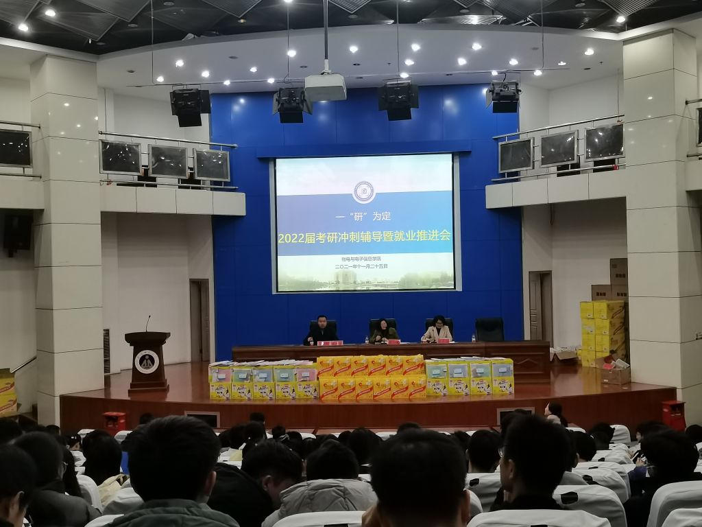 在敬文图书馆报告厅举办2022届毕业生一“研”为定考研冲刺辅导暨就业推进会。学院党委书记李娟、党委副书记黄友生、副院长张爱清,2022届毕业班辅导员汪光麒、刘冠琪、董栩婷以及全体2022届本科毕业生参加会议。会议由黄友生主持。