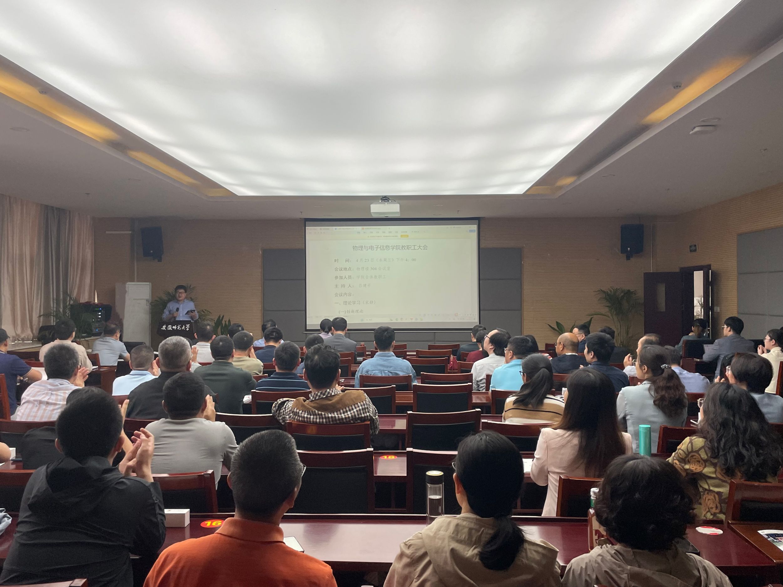 在物理楼304会议室召开全体教职工大会,开展政治理论学习,总结前期工作,布置近期任务。学院全体教职工参加会议。会议由院长吕建平主持。