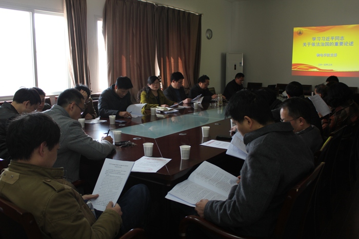 召开党委扩大会,学习习近平总书记关于依法治国的重要论述,传达学校3月10日院级党组织负责人学习会会议精神,布置2015年重点工作。学院领导班子全体成员、院党委委员、专业平台负责人、科研平台负责人、各支部书记参加学习。行政副院长甘为民主持会议。 李娟首先带领全体参会人员学习了十八大以来习近平同志关于依法治国的重要论述,通过坚持公正司法、坚持严格执法、坚持全民守法三大部分进行了详细解读;会议传达了学校3月10日院级党组织负责人学习会会议精神;大家集体研读了习近平总书记在省部级主要领导干部学习贯彻十八届四中全会精神全面推进依法治国专题研讨班上的重要讲话。通过学习,全体参会人员充分认识到领导干部要做尊法学法守法用法的模范,积极运用法治思维和法治方式深化改革。李娟强调,大家一定要深刻领会习近平总书记关于依法治国的重要论述,要主动适应全面依法治国新常态,牢记法律红线不可逾越,法律底线不可触碰,带头依法办事、依规办事、按程序办事,营造学法懂法守法的良好氛围,以法治思维和法治方式立规则、树标准、建示范,把坚持依法治国和以德治国结合起来,推进学院科学发展。