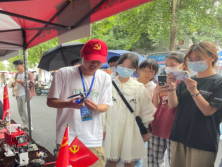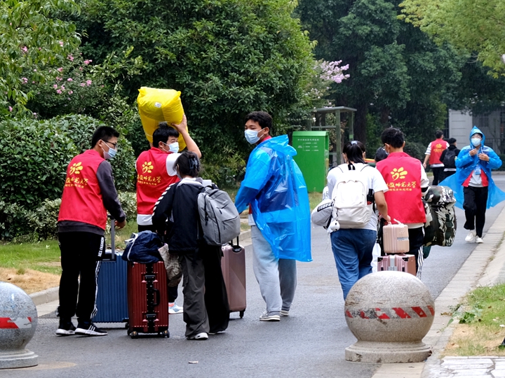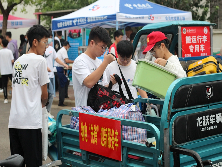 安排党员先锋负责校园内大巴车接送点引导工作。“新生来了,快去帮忙!”一辆从车站载着新生的校园大巴还未停下,党员志愿者们就陆续上前,在车停下时,第一时间接过新生的行李,带领他们前往各个学院报到点。